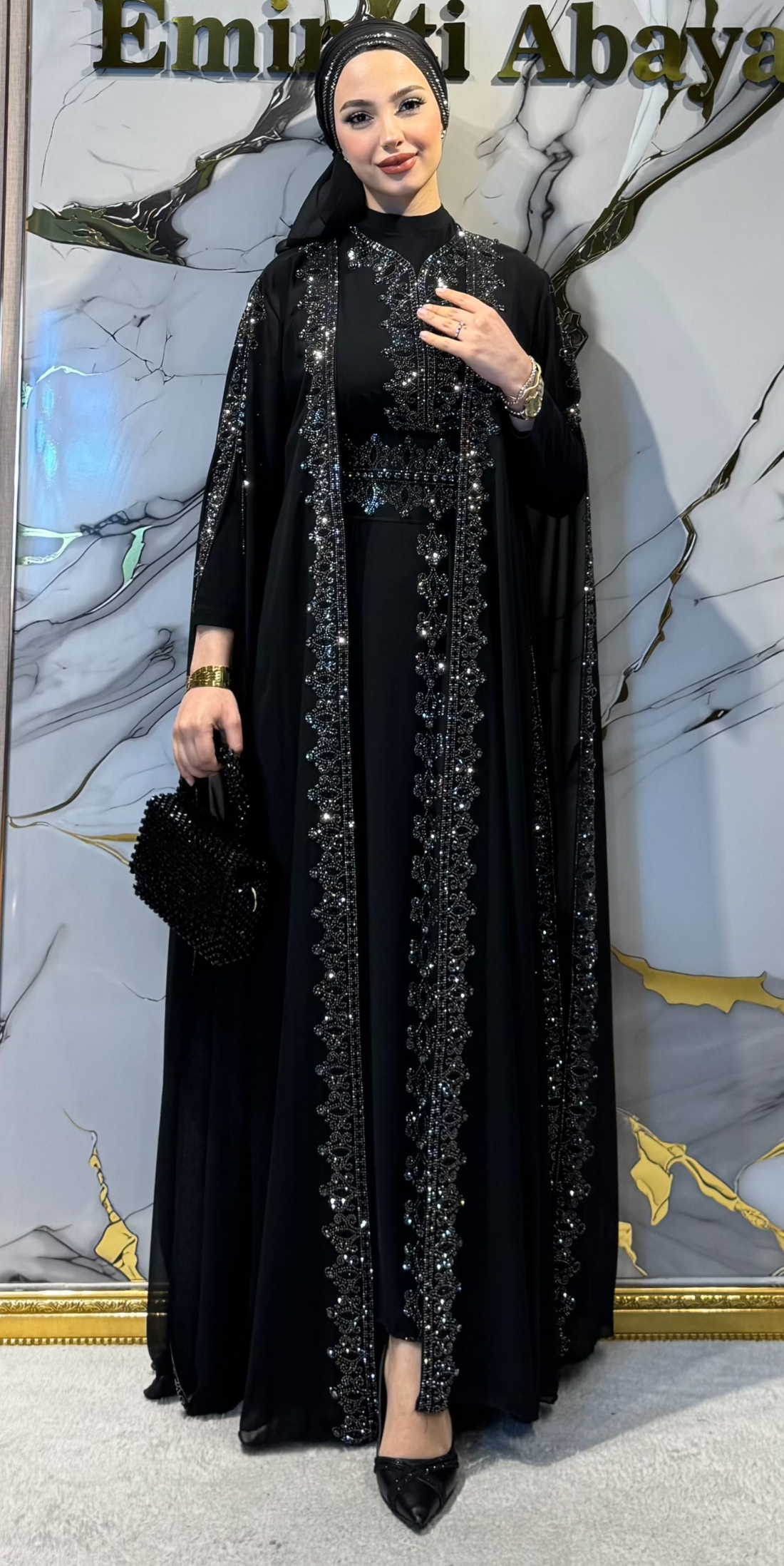 Zamansız zarafeti, muhteşem Yöresel Siyah Abaya takımımızla keşfedin. Bu premium set, geleneksel Yöresel tasarım unsurlarıyla özenle hazırlanmış, her harekette ışığı yakalayan etkileyici hematit taş süslemelerle bezenmiş sofistike bir siyah abayadan oluşmaktadır.