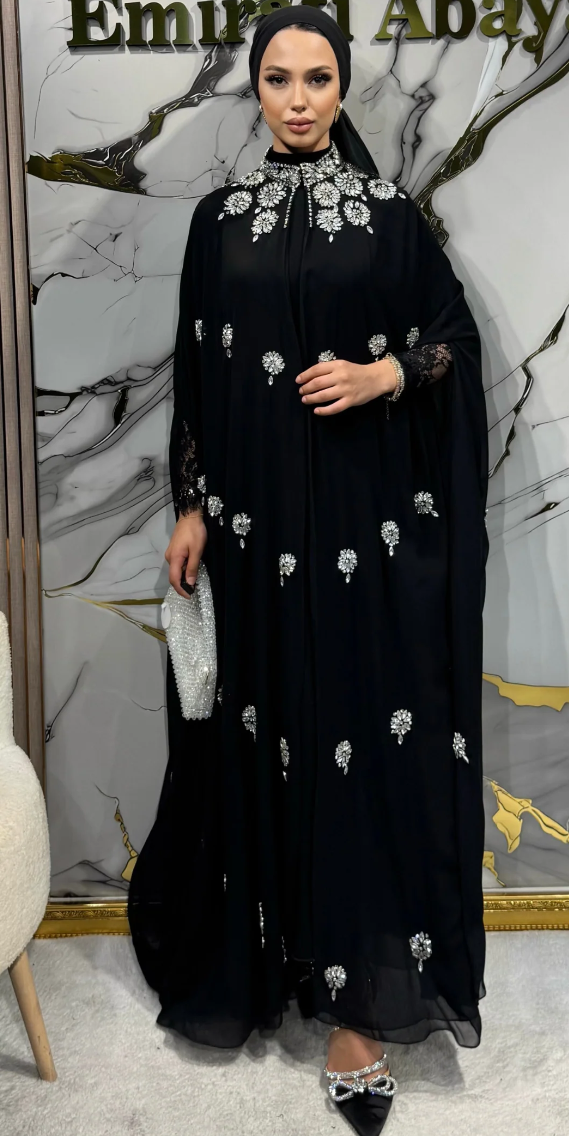 Etek Uçları Swarovski Taşlı Siyah Abaya TM23 WSB - Şal Dahil Zarif Model