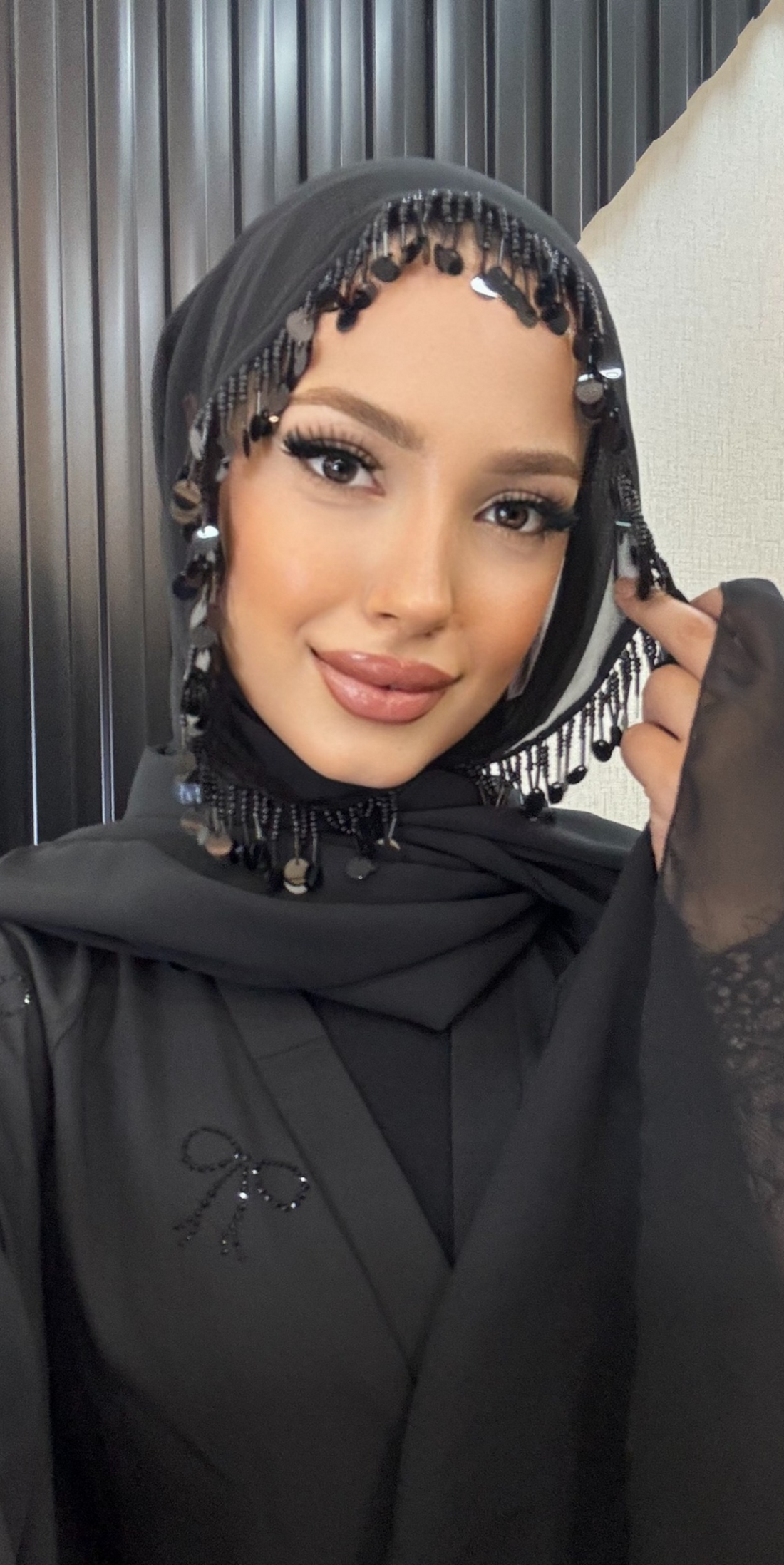 Uç kısımları sallantılı siyah taşlarla süslenmiş şifon siyah şal. Abayalarla mükemmel uyum sağlar.