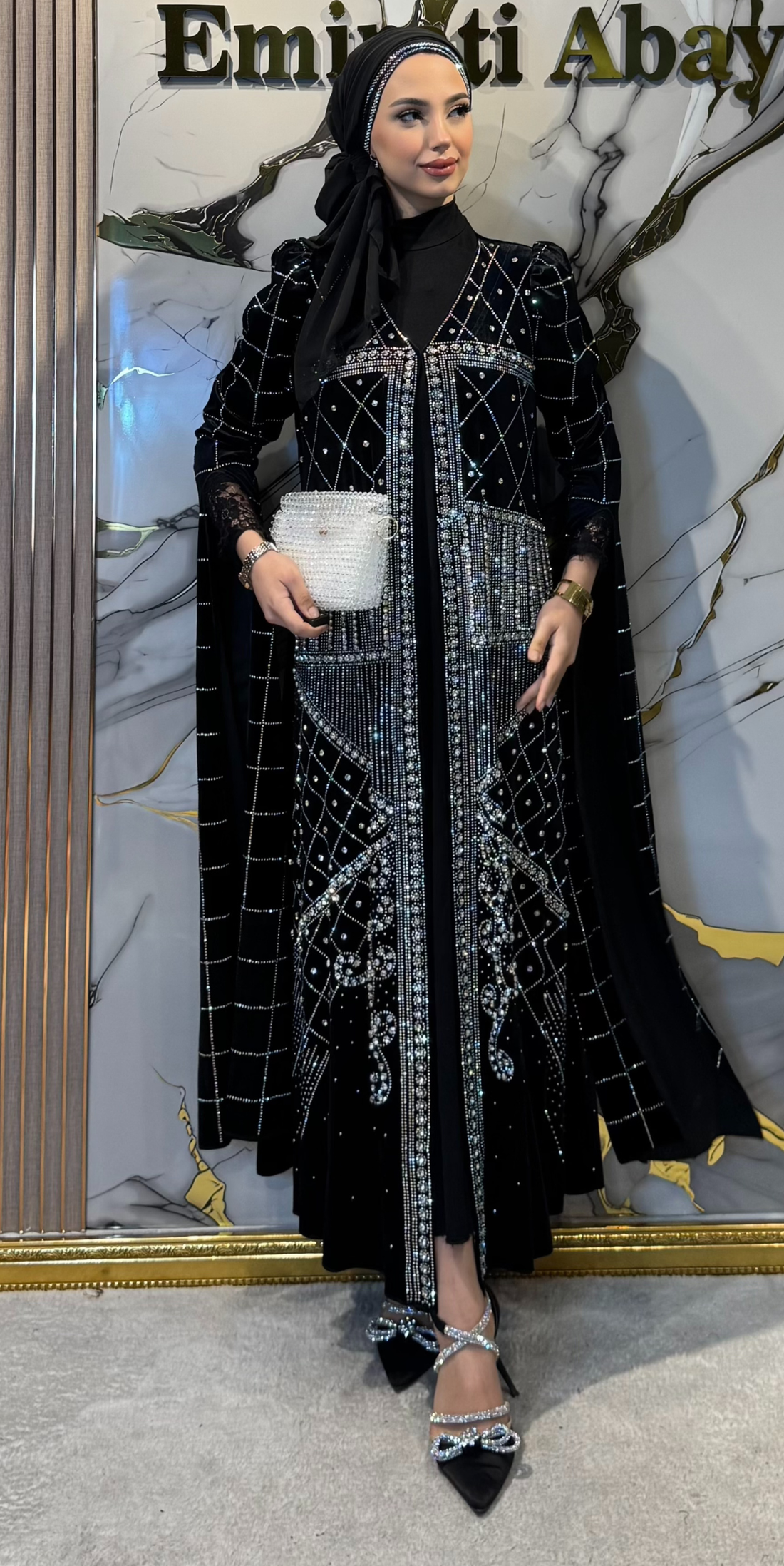 TM39 HSVB Yüksek kaliteli siyah kadife kumaştan üretilen bu özel abaya, hematit taş ve Swarovski...