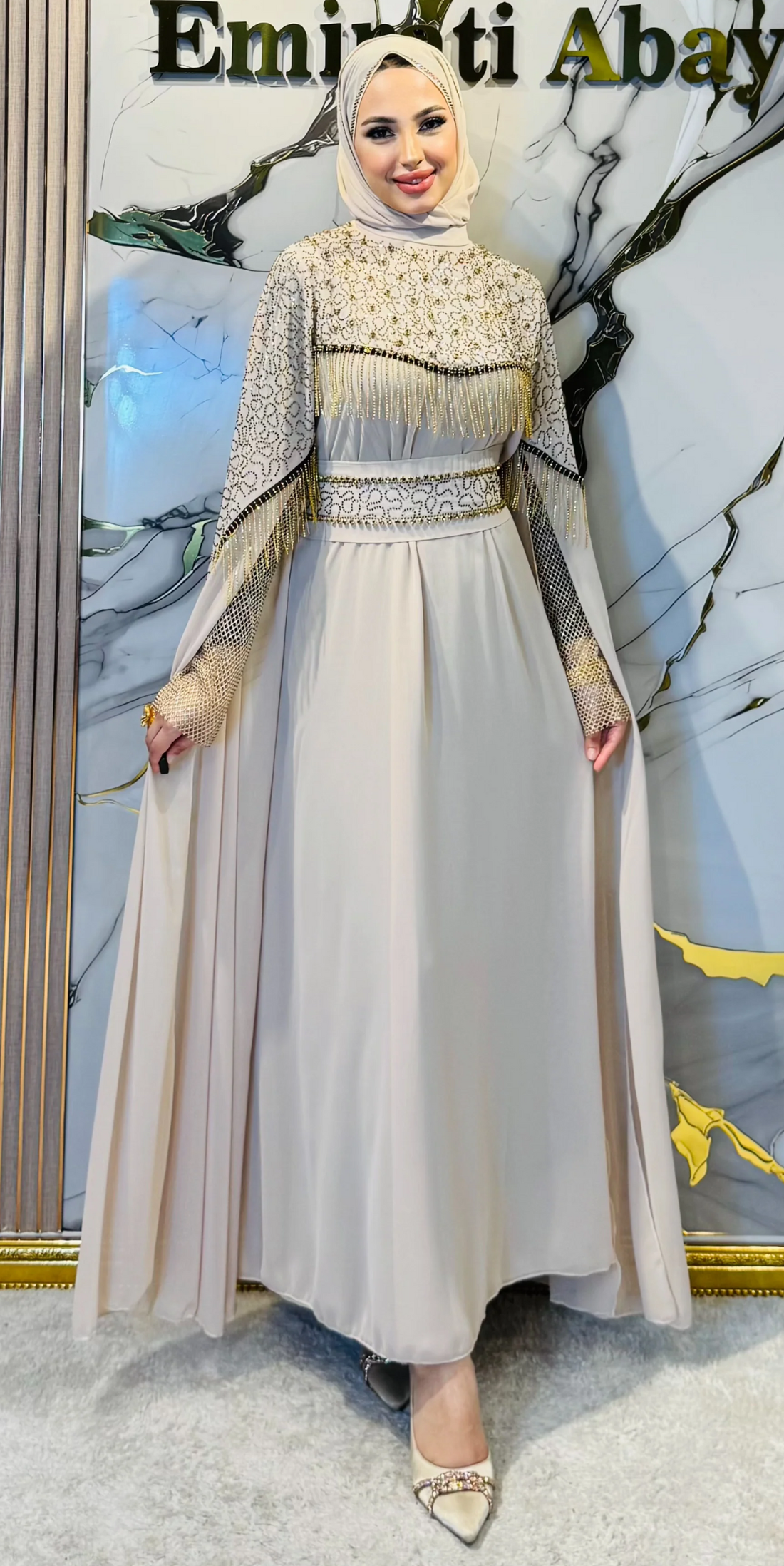 Bu zarif krem abaya, akıcı şifon kumaşı ve özenle işlenmiş taş detaylarıyla lüks bir görünüm...