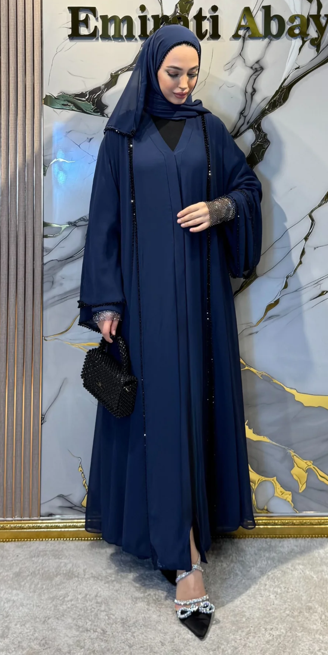 Bu şık lacivert abaya, kendi eşarpı ile birlikte gelir. Kumaşı hafif şifondur ve günlük kullanım...
