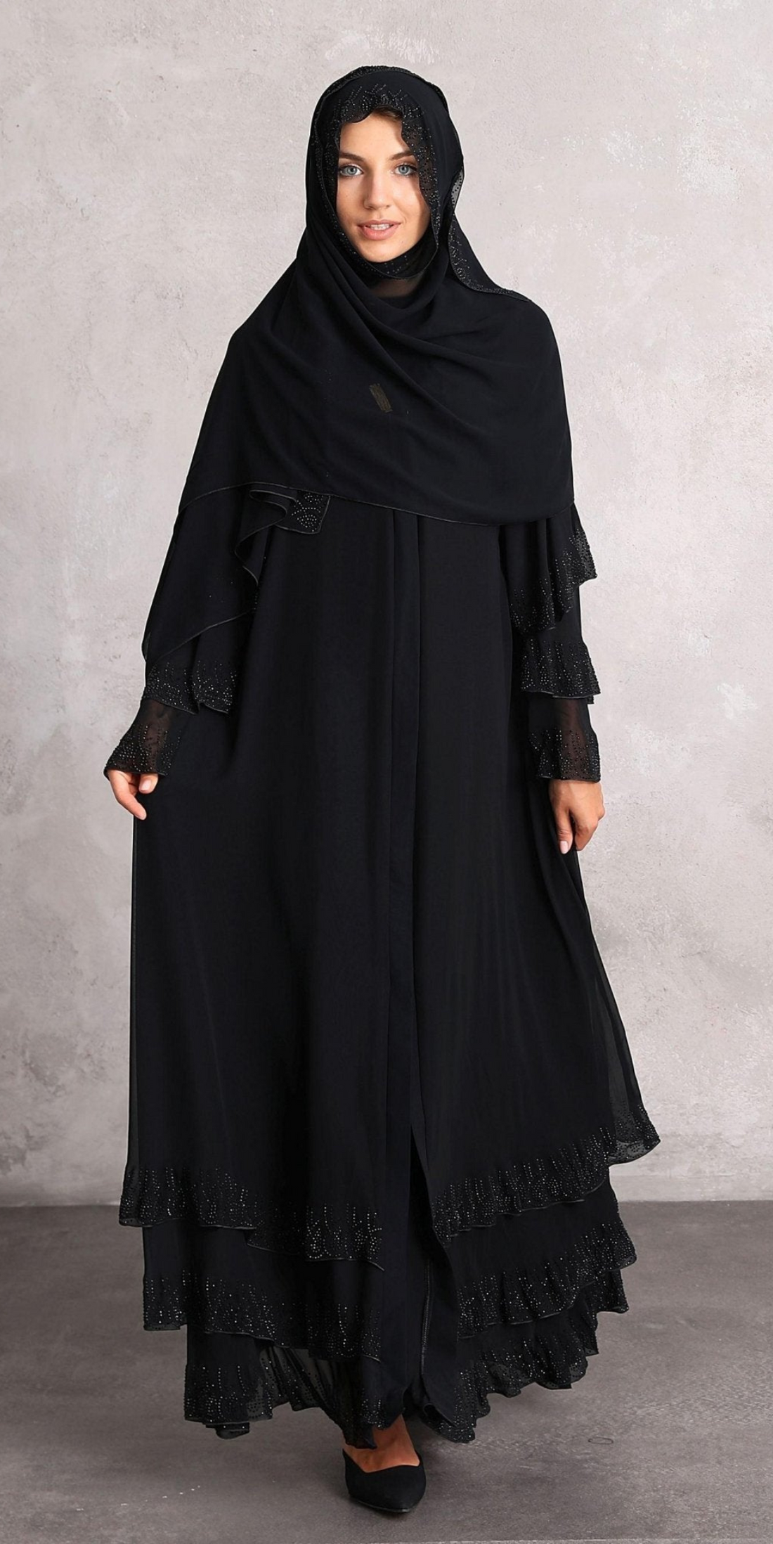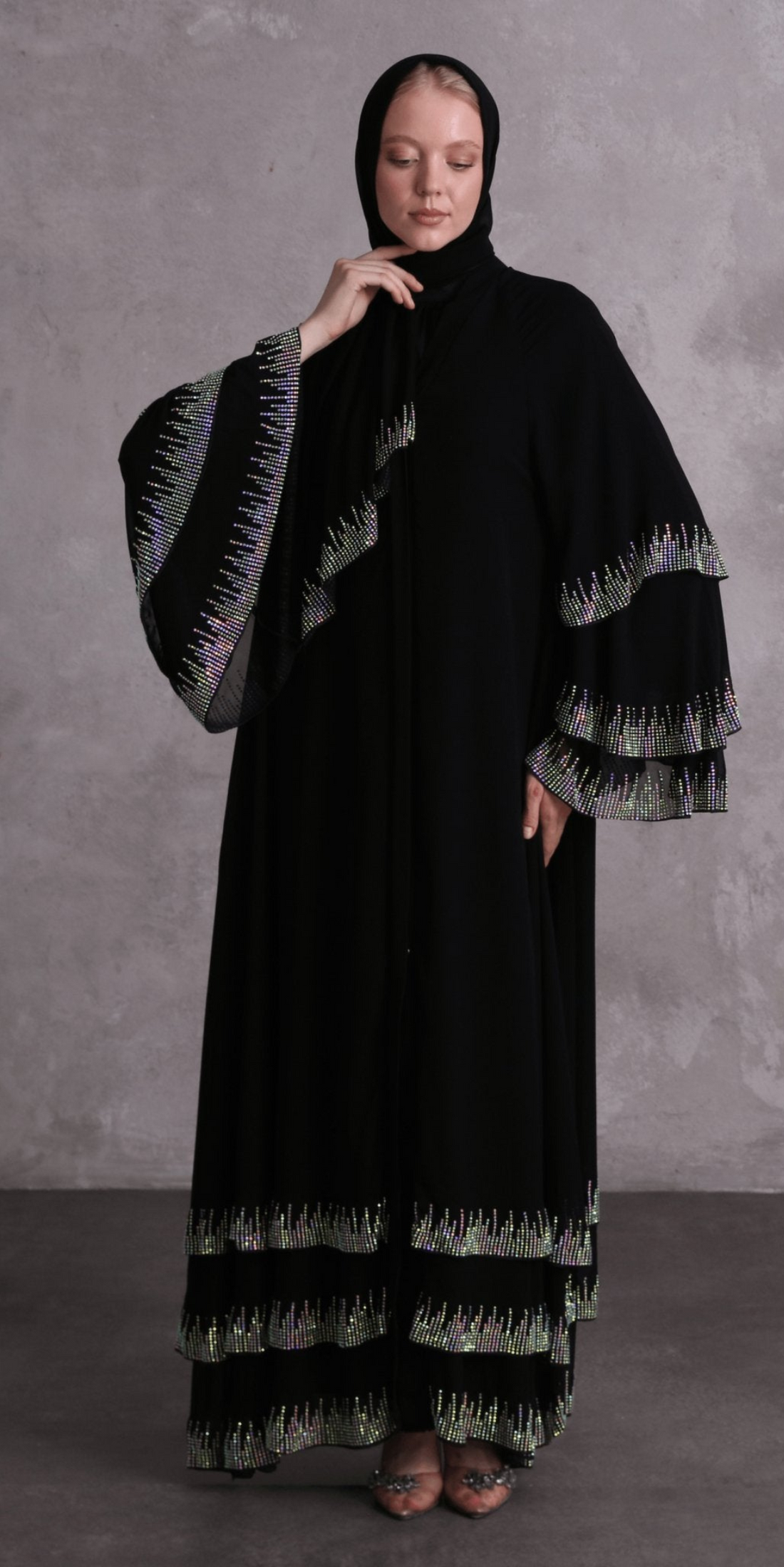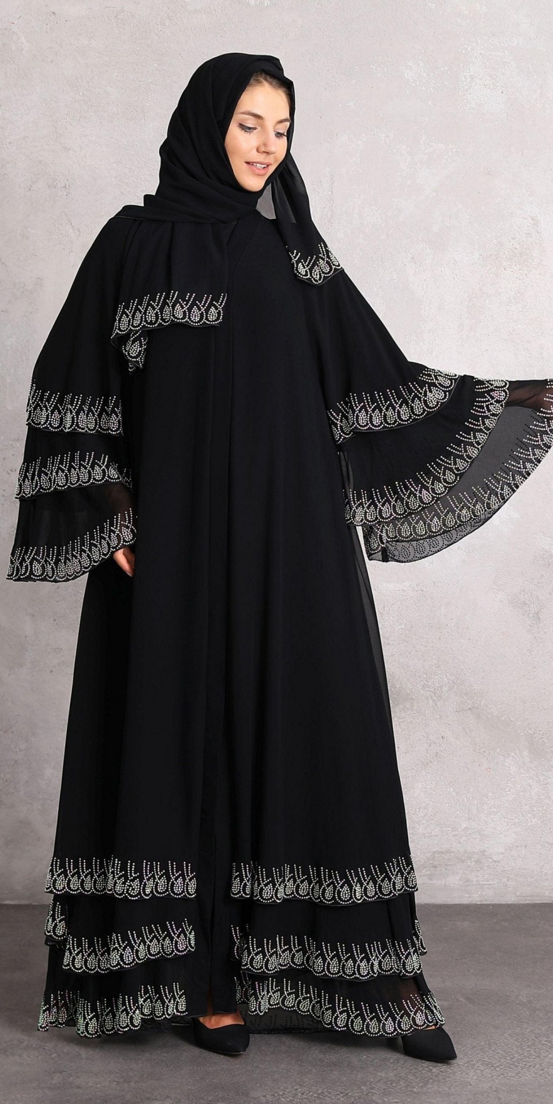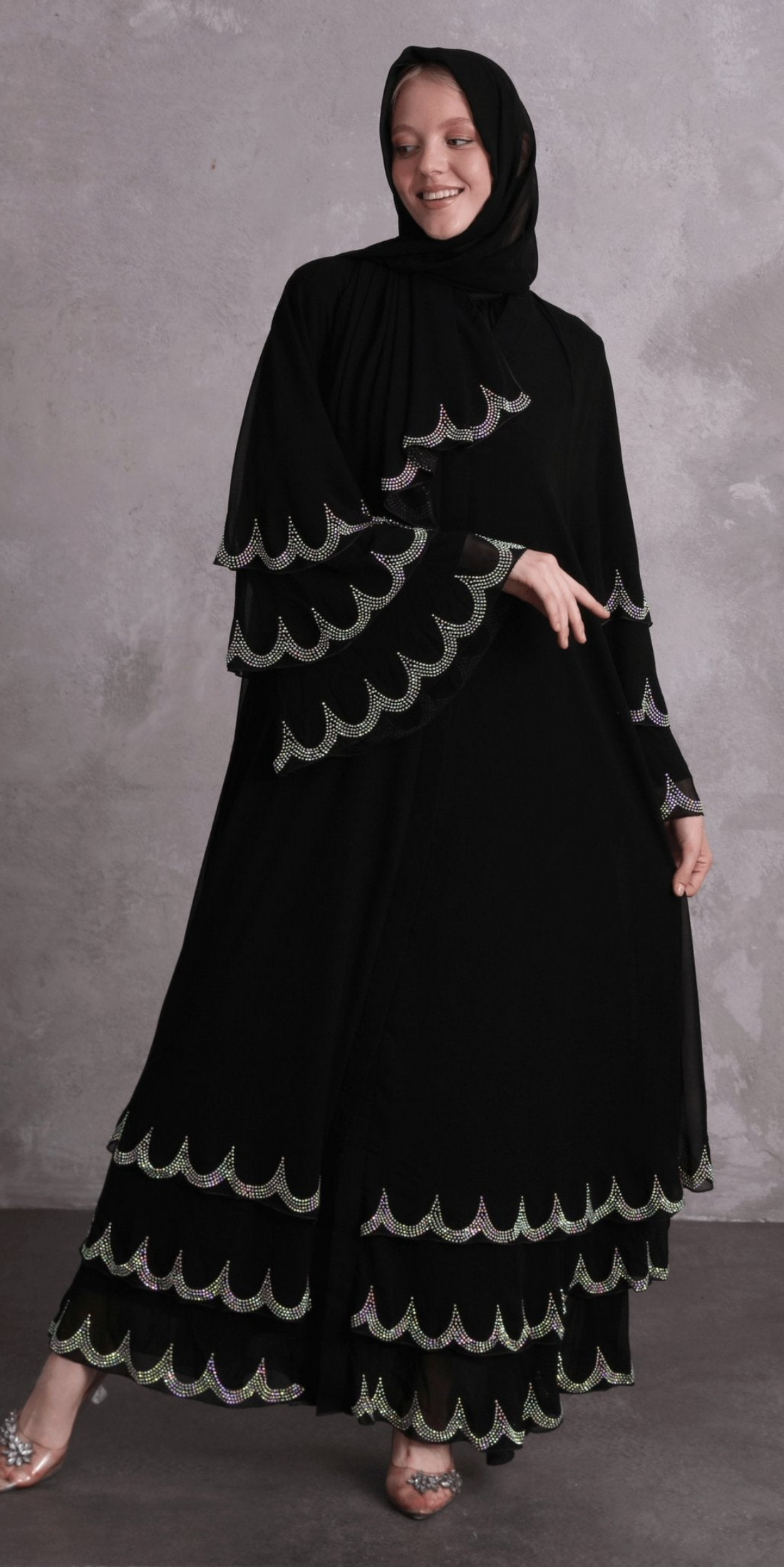 عباية سوداء أنيقة متعددة الطبقات مرصعة بأحجار سواروفسكي مصممة لتضفي لمسة من الأناقة على أيامك...
