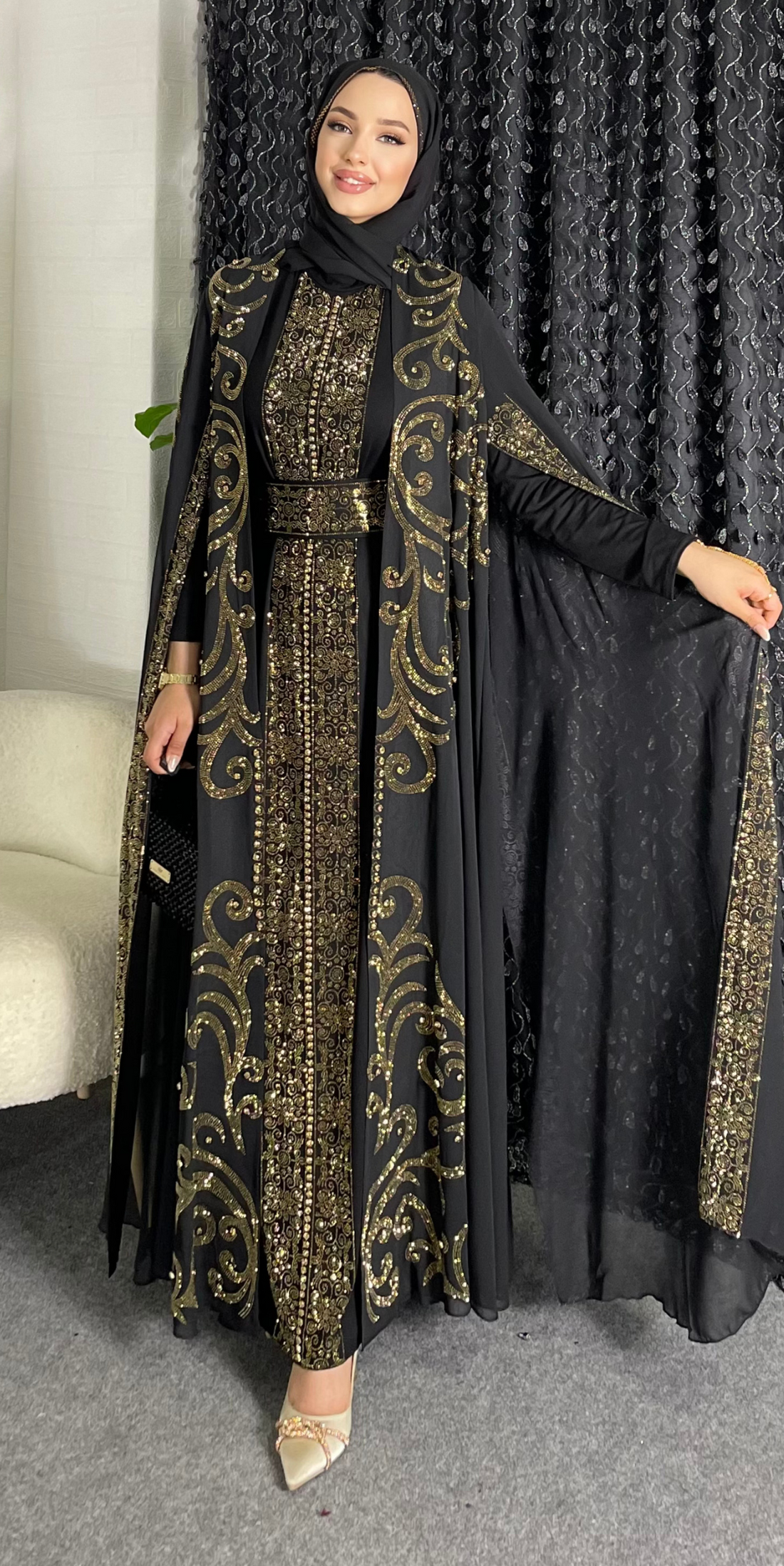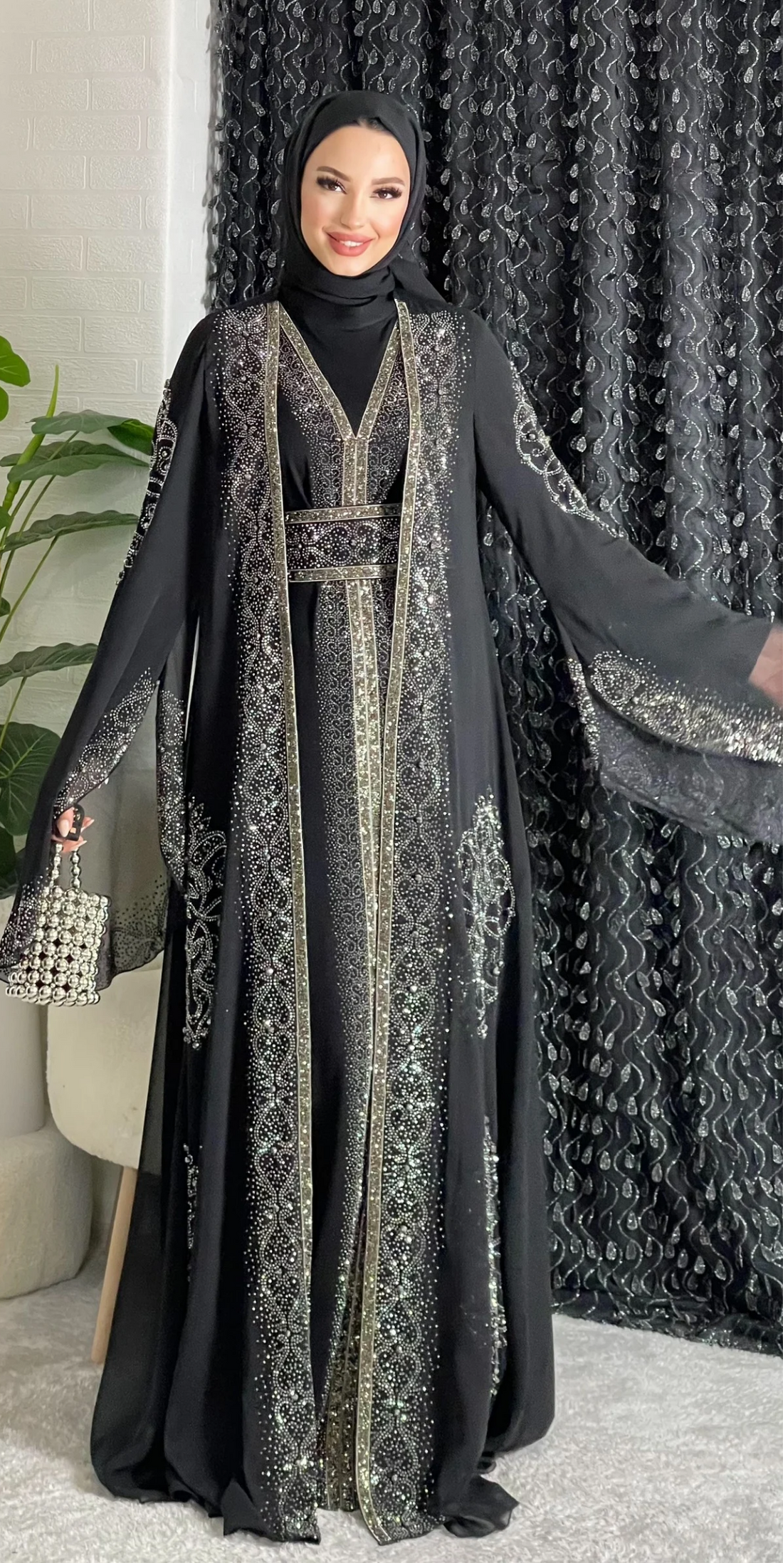 العباءة السوداء، مع حوافها المزينة بأحجار سواروفسكي، تجمع بين الأناقة والأسلوب. في حين أنه يوفر...