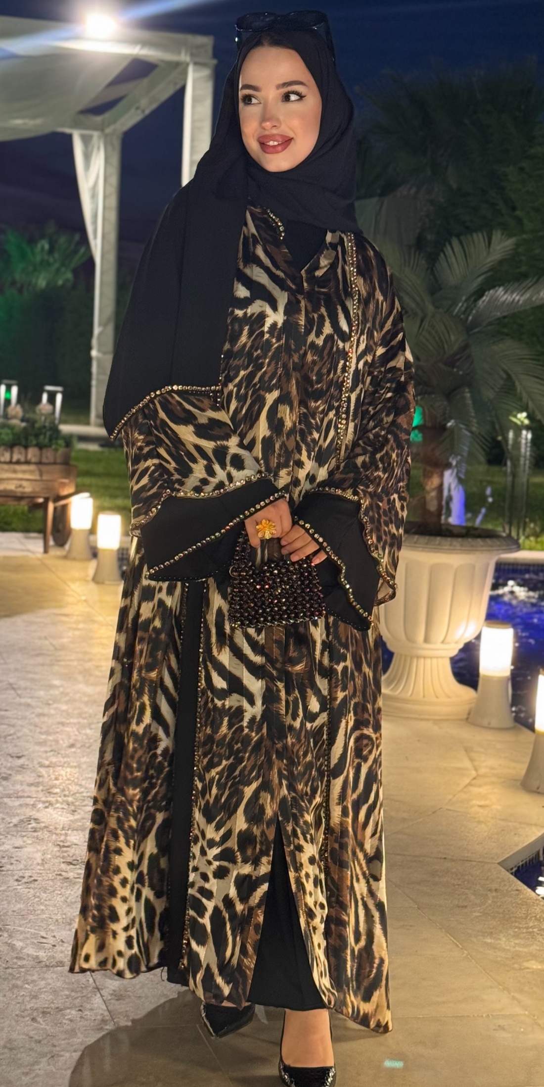 عباية من الحرير بنقشة جلد النمر وفتحة أمامية تمنحك أناقة لافتة للنظر بتصميمها الأنيق وتفاصيلها...