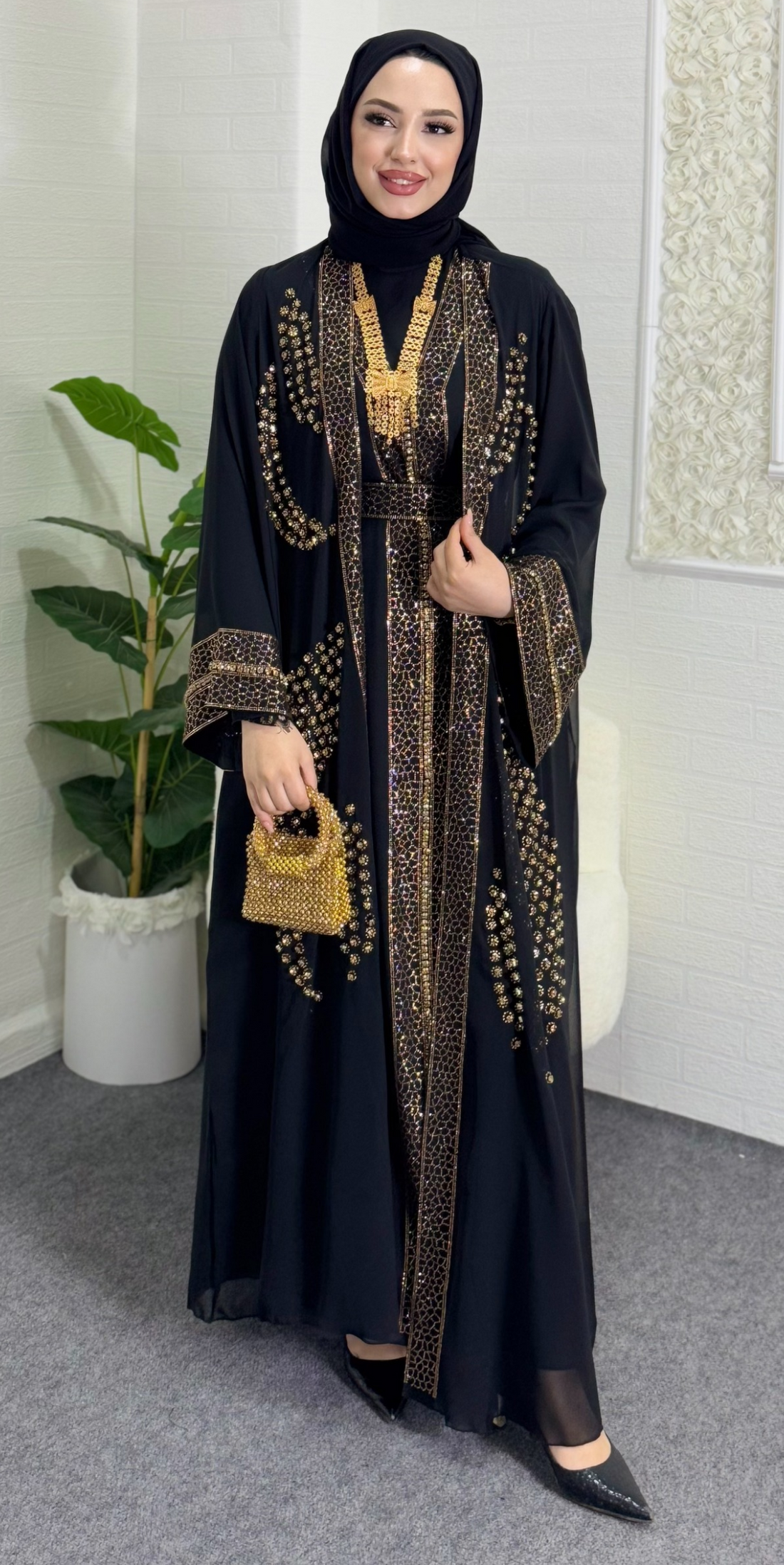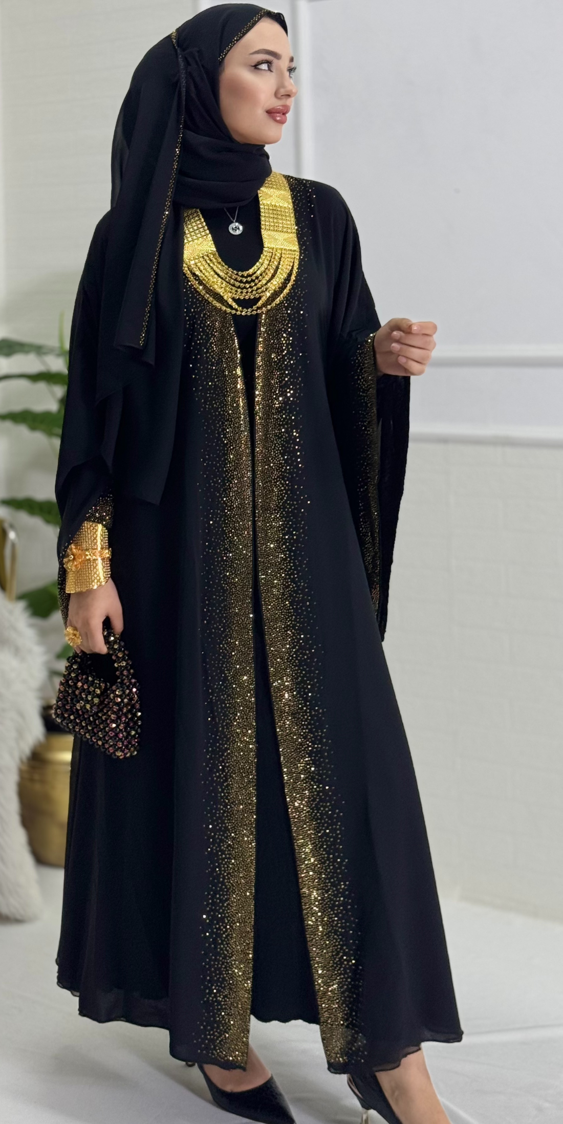 عباية شيفون بأكمام طويلة مزينة بأحجار سوداء وذهبية