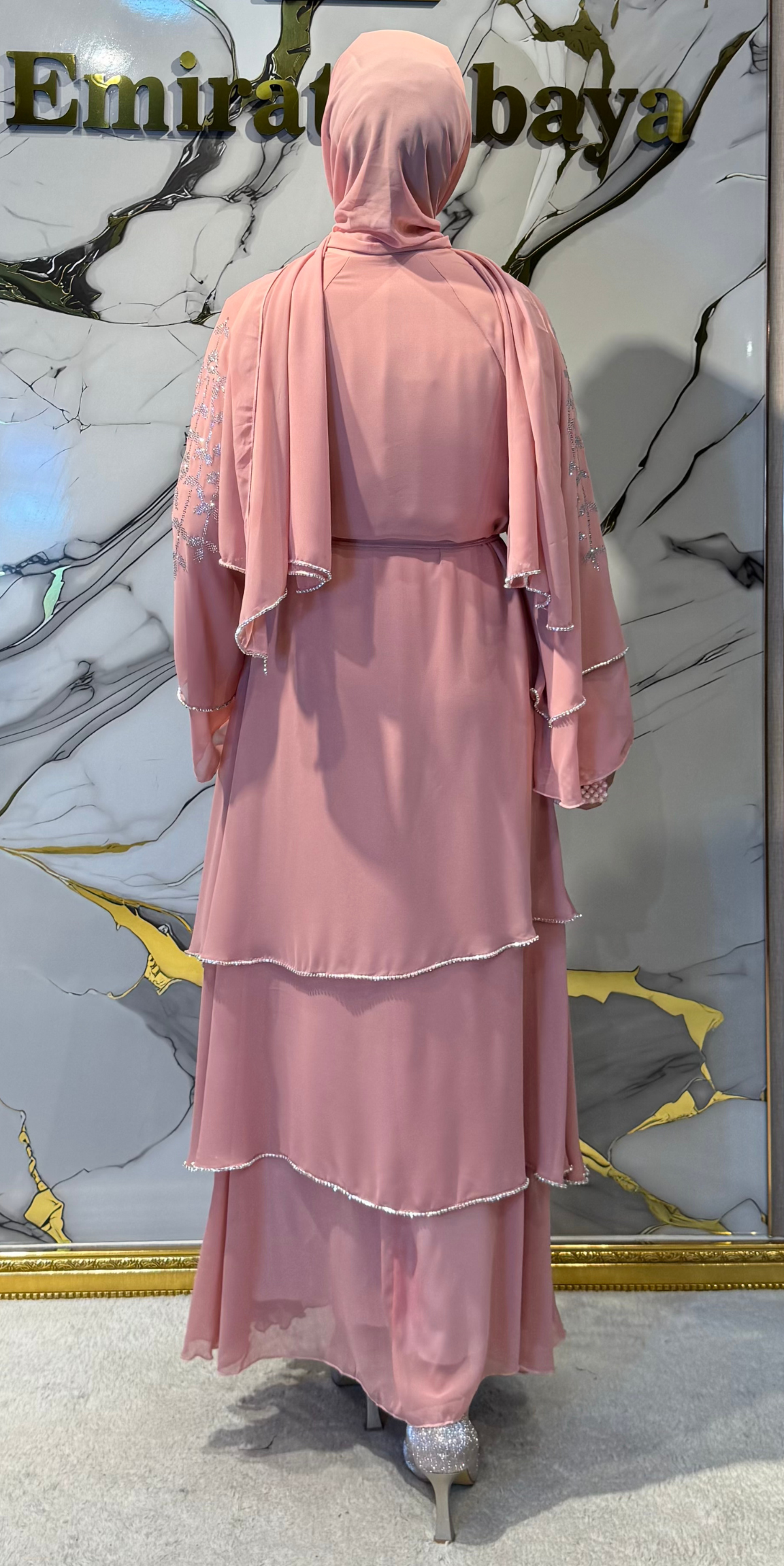 3 Katmanlı Pembe Şifon Taş Detaylı Barbie Abaya Şal ve Kemer Seti
