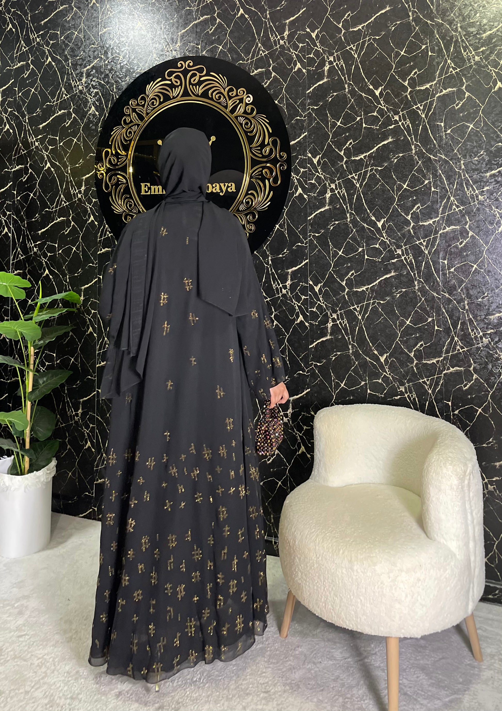 Modern şıklığı yansıtan bu siyah chiffon abaya, tamamına yayılmış gold renkli yapışkan taşlarla oluşturulan geometrik desen ile ışıkta etkileyici bir ışıltı sunar. Zamansız ve iddialı bir duruş arayanlar için ideal.