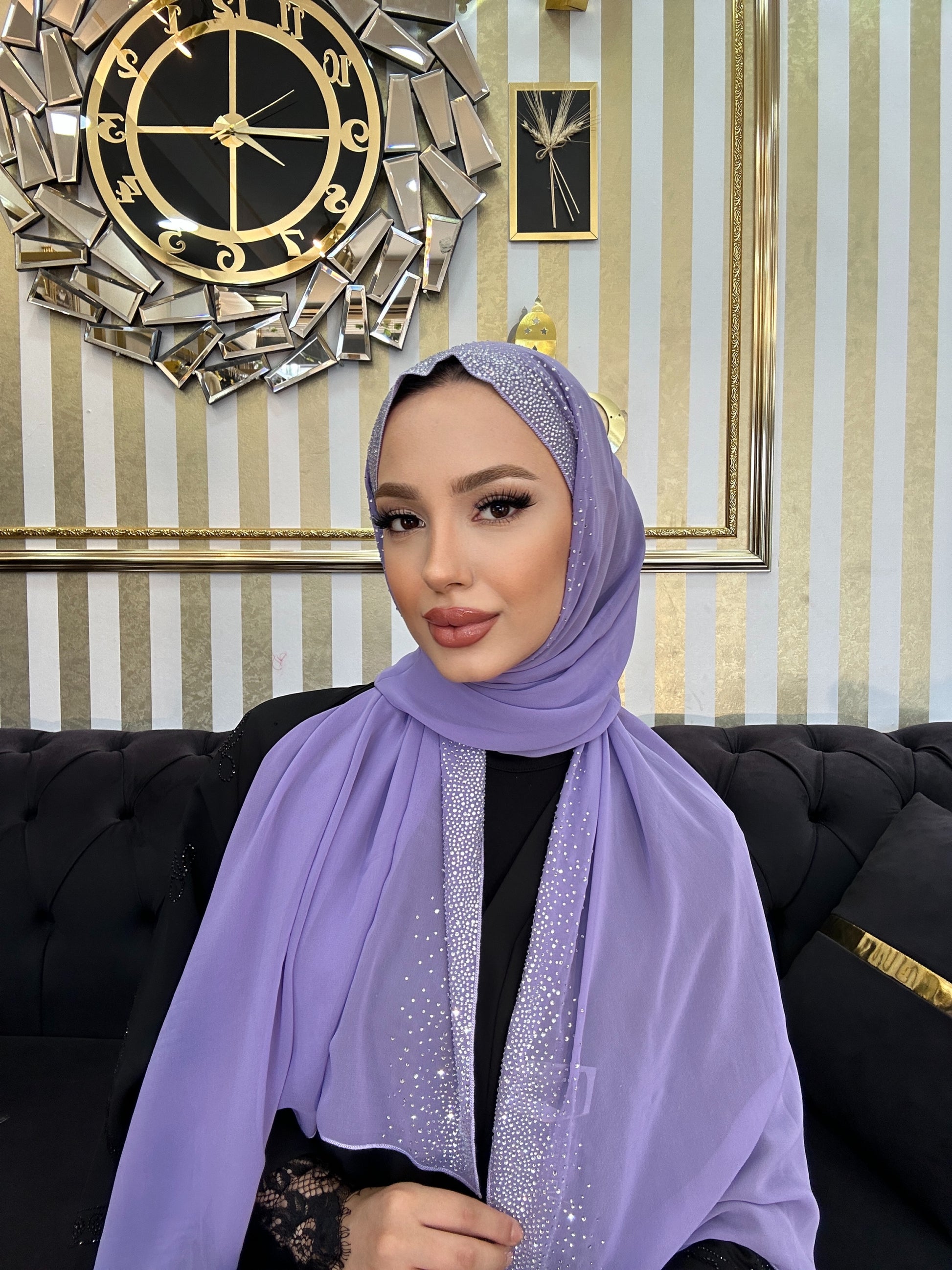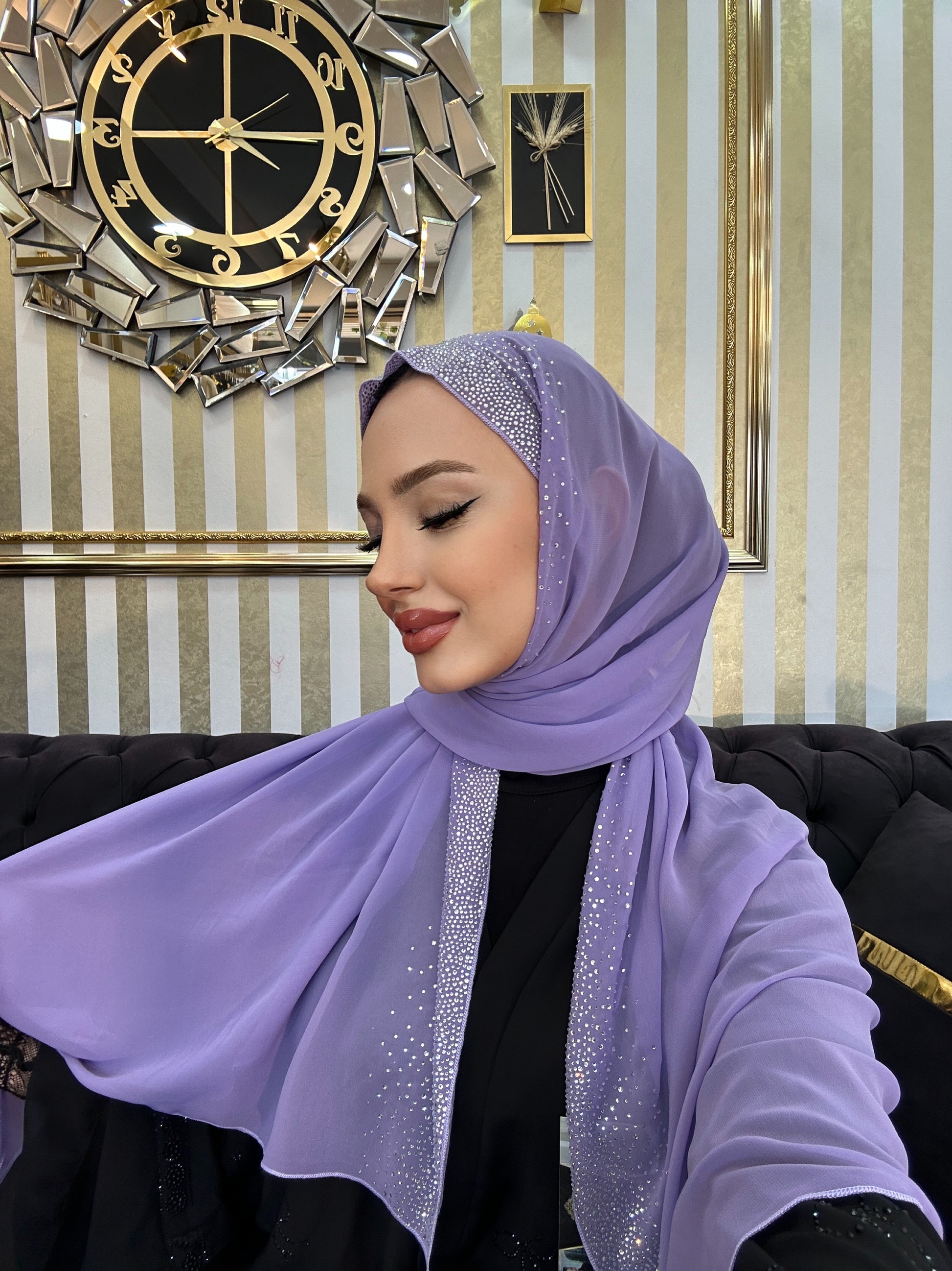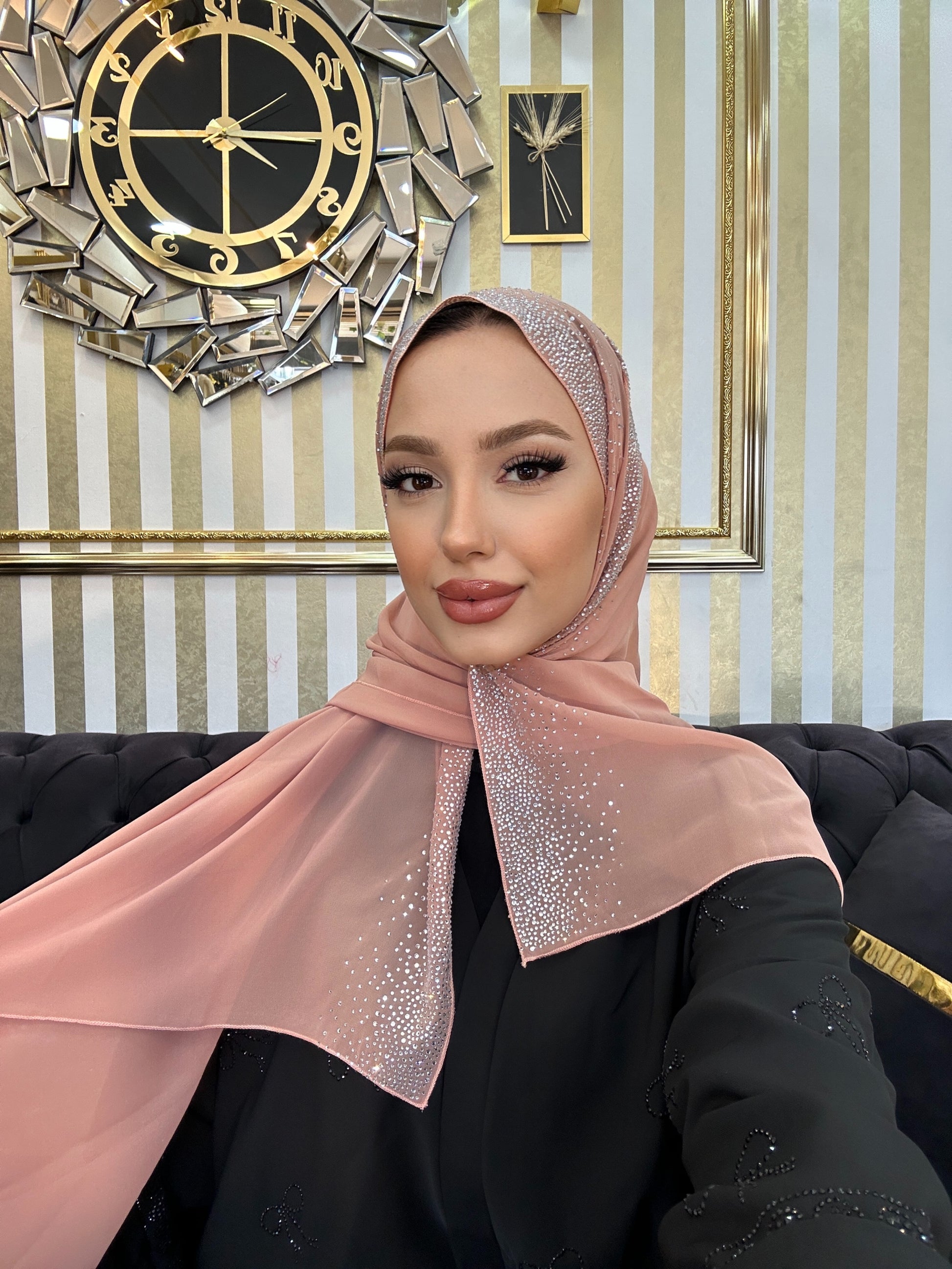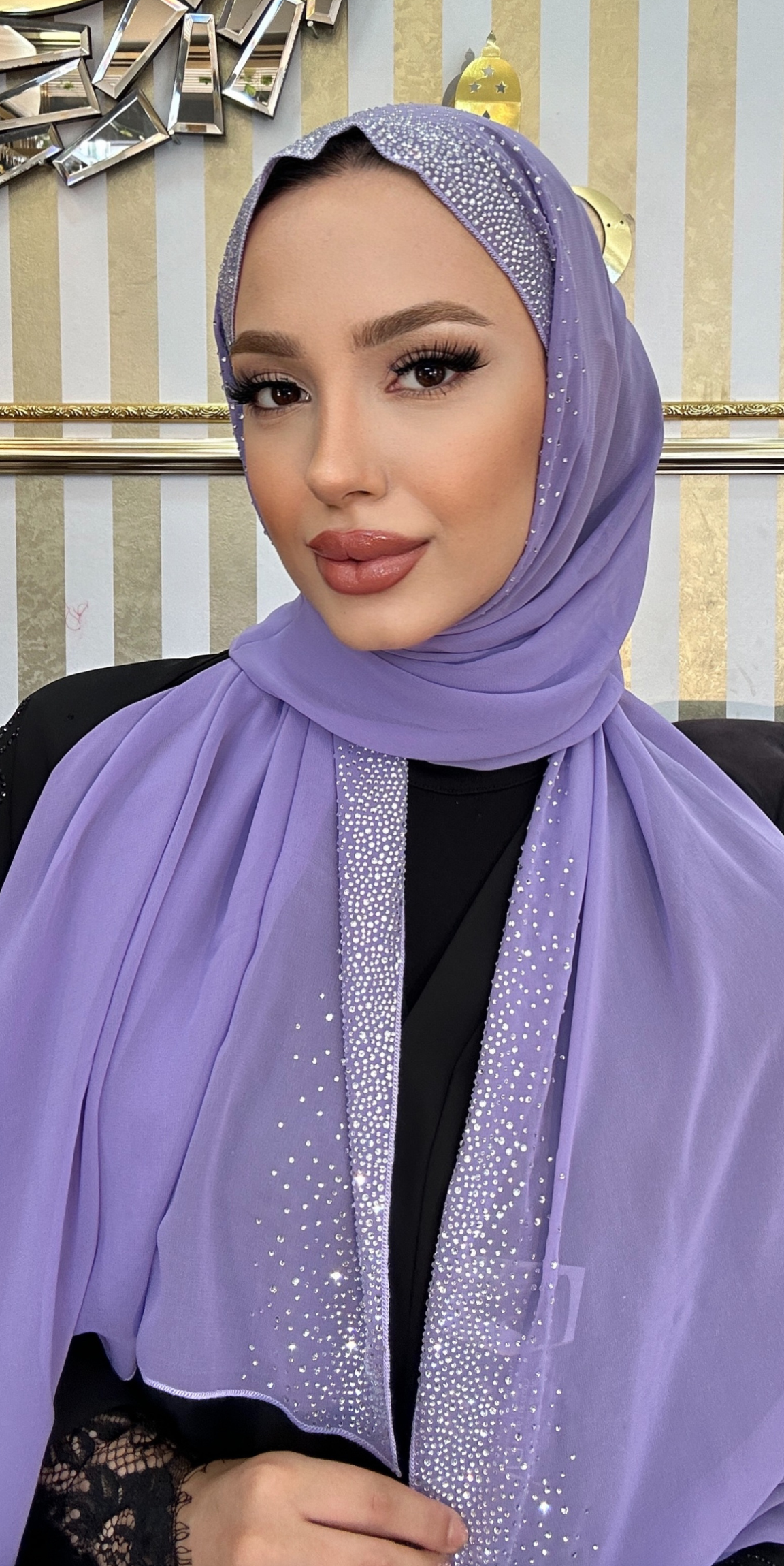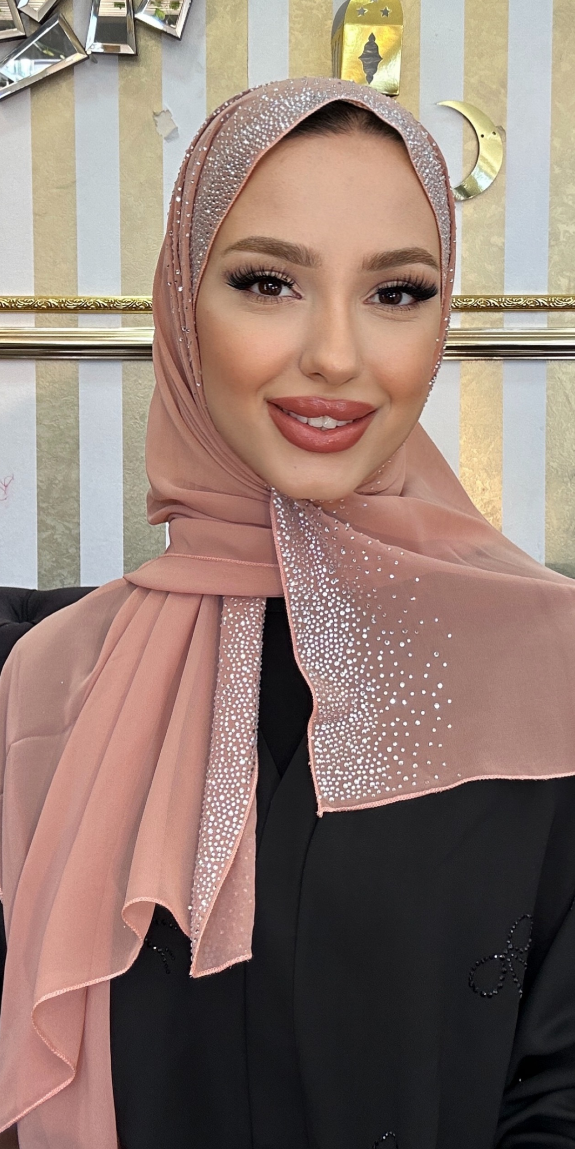 Tamamen şifon kumaştan üretilen bu özel şal modeli, ön kısmında yoğunlaşıp aşağı doğru incelen taş yağmuru efekti ile tasarlanmıştır. Taşların dizilimi baş kısmında taç gibi bir görünüm sunarken, ışıkla birlikte zarif bir ışıltı sağlar.