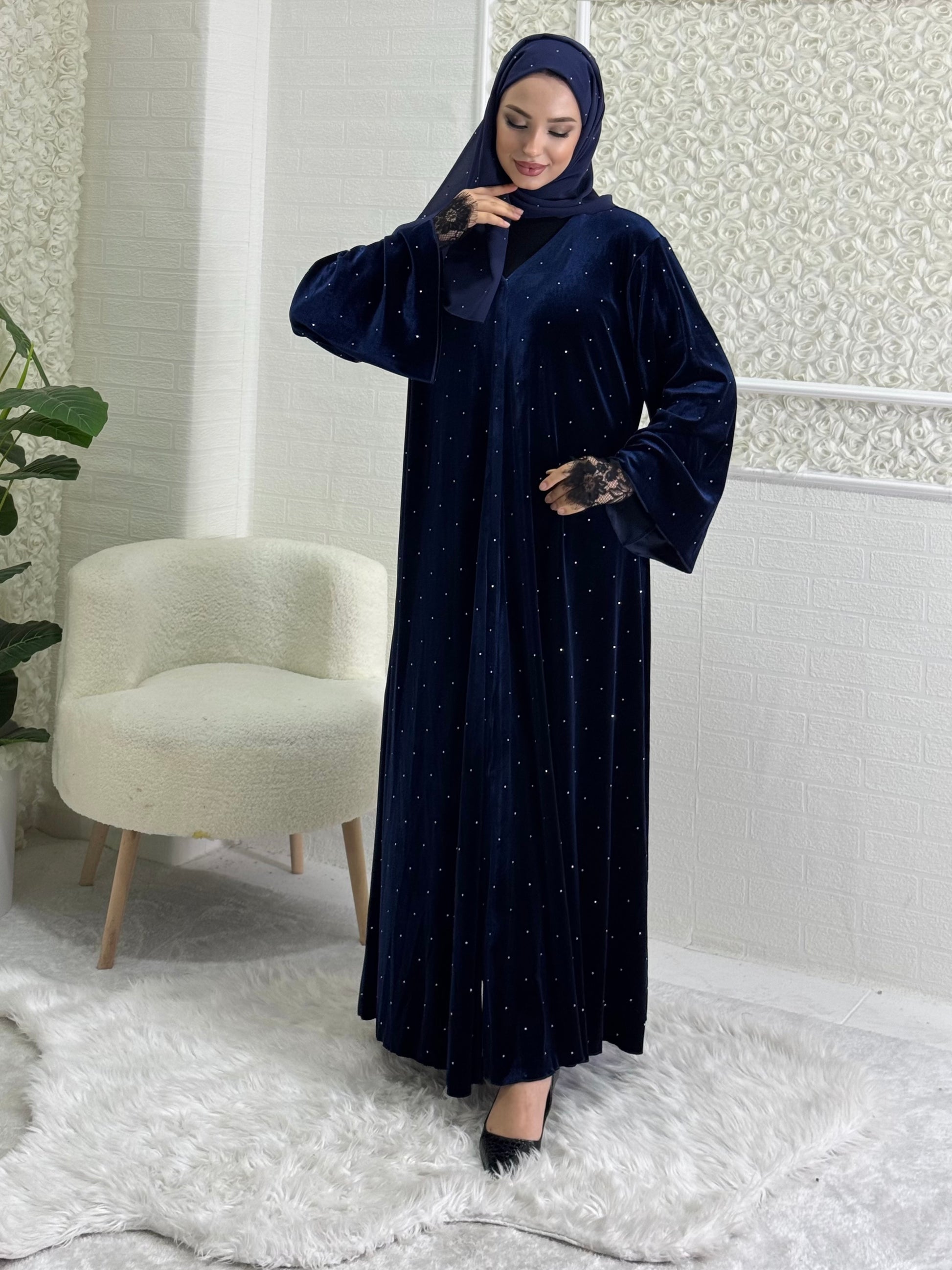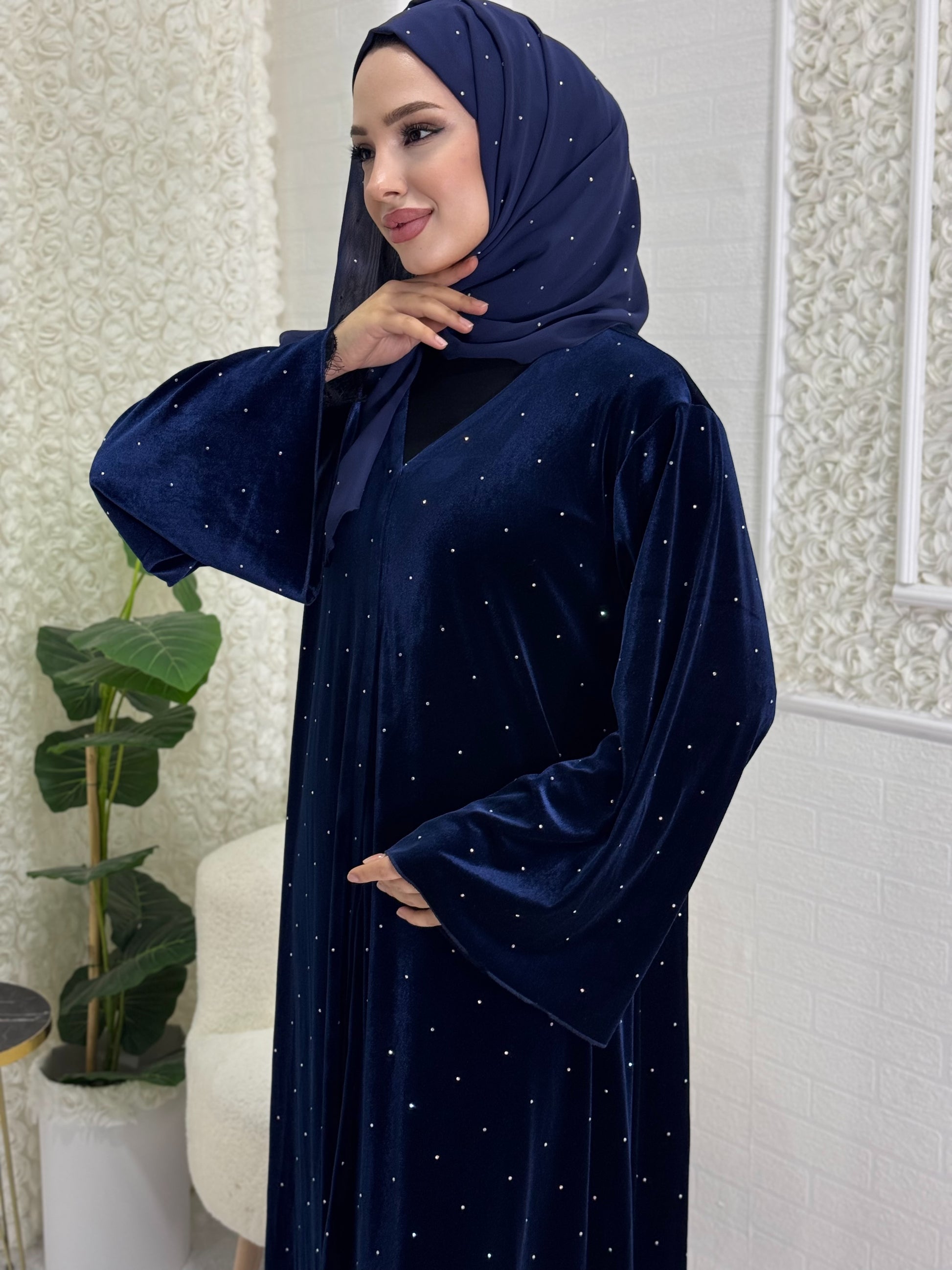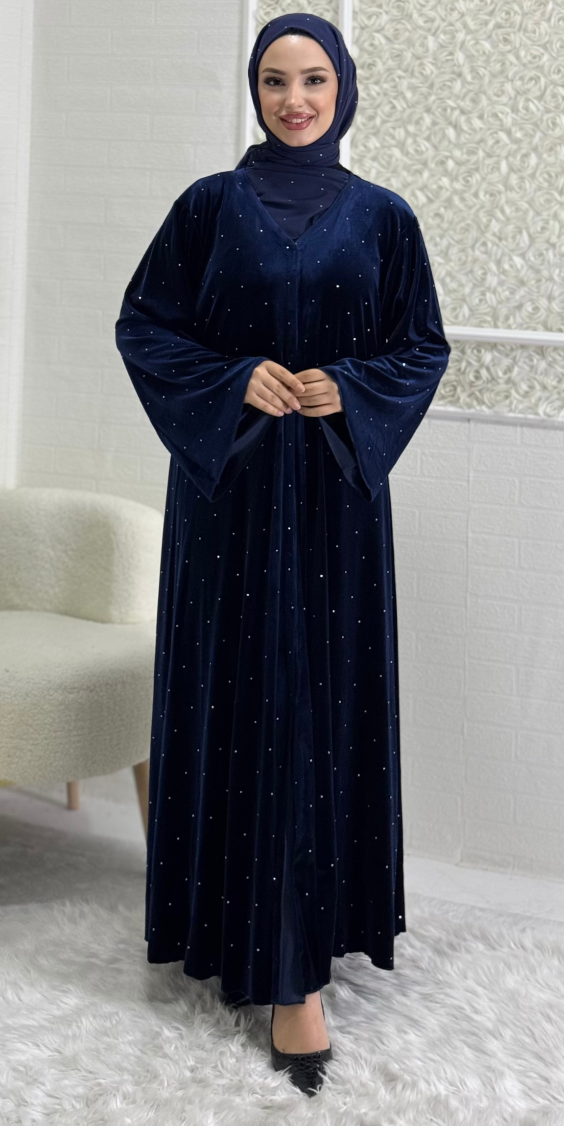 Zarif lacivert kadife dokusu ve nokta nokta yerleştirilmiş janjan taşları ile öne çıkan bu abaya, günlük şıklık ve özel davetler için ideal. Hafif ve rahat yapısı ile hem konforlu hem de ışıltılı bir görünüm sunar. Sadece şalı ile birlikte satılır, içlik dahil değildir.