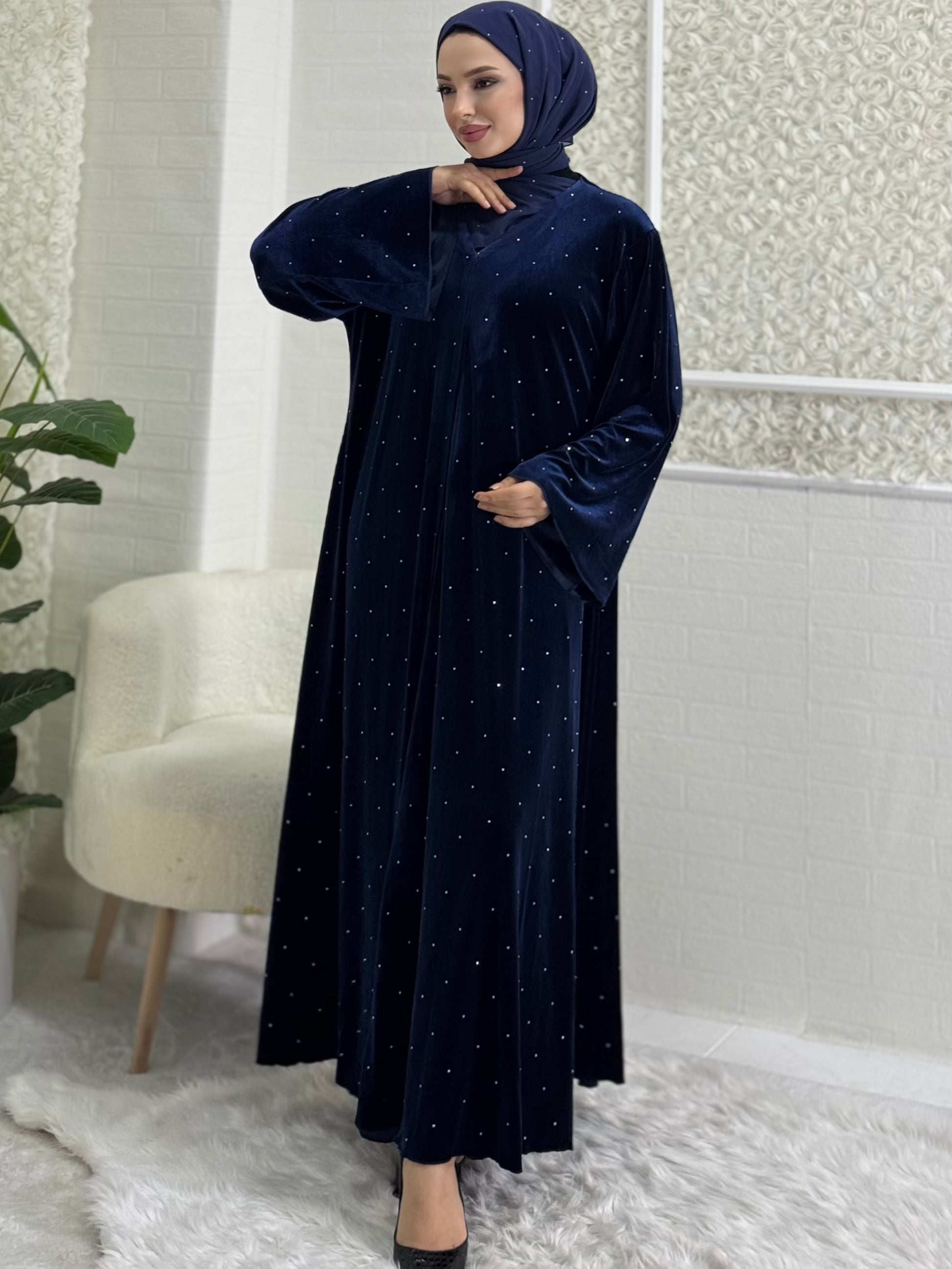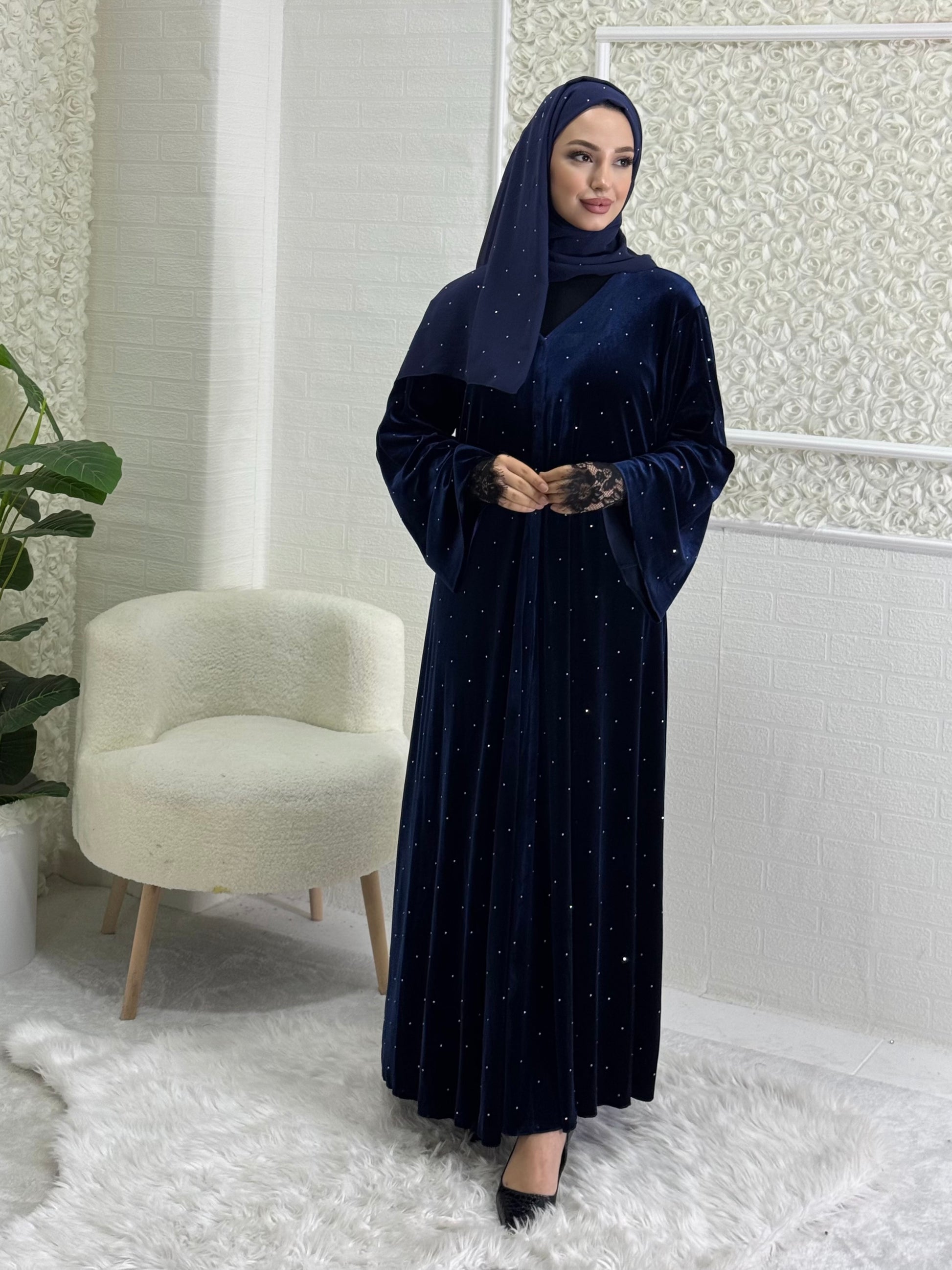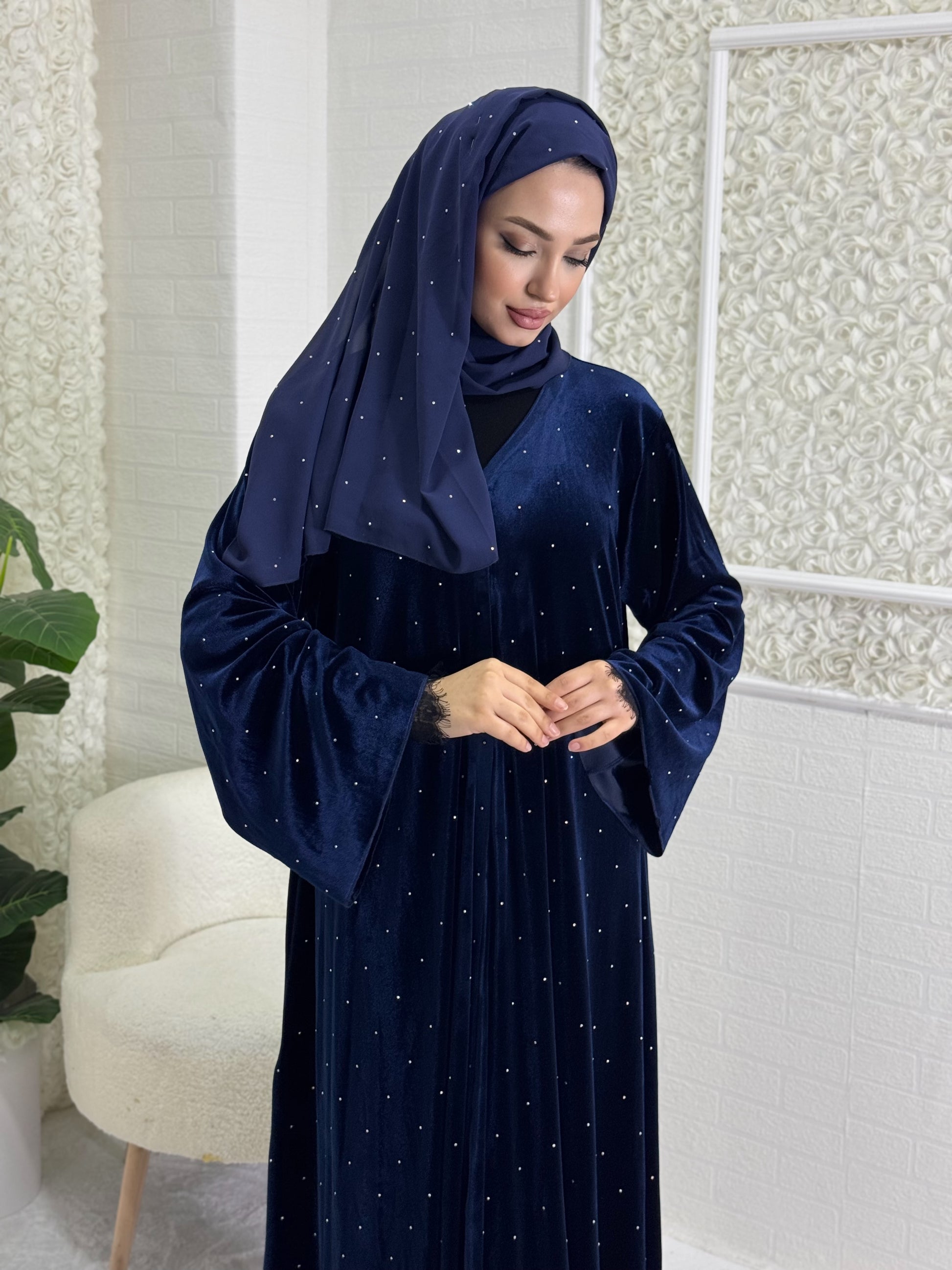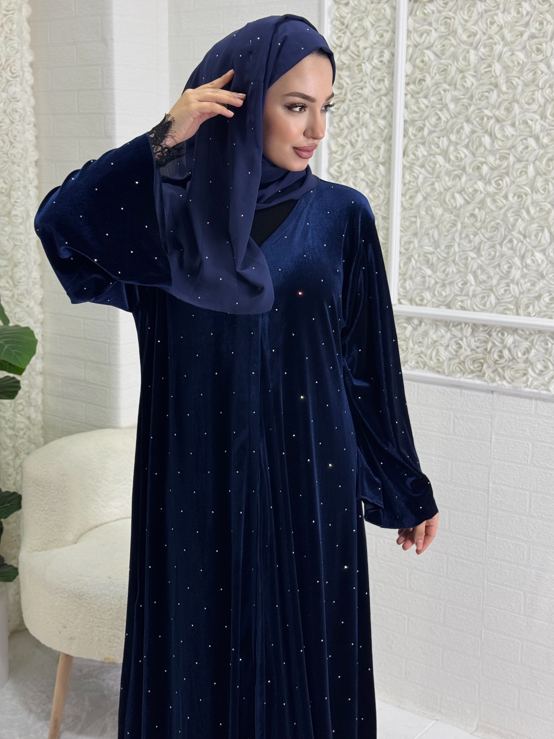 Zarif lacivert kadife dokusu ve nokta nokta yerleştirilmiş janjan taşları ile öne çıkan bu abaya, günlük şıklık ve özel davetler için ideal. Hafif ve rahat yapısı ile hem konforlu hem de ışıltılı bir görünüm sunar. Sadece şalı ile birlikte satılır, içlik dahil değildir.