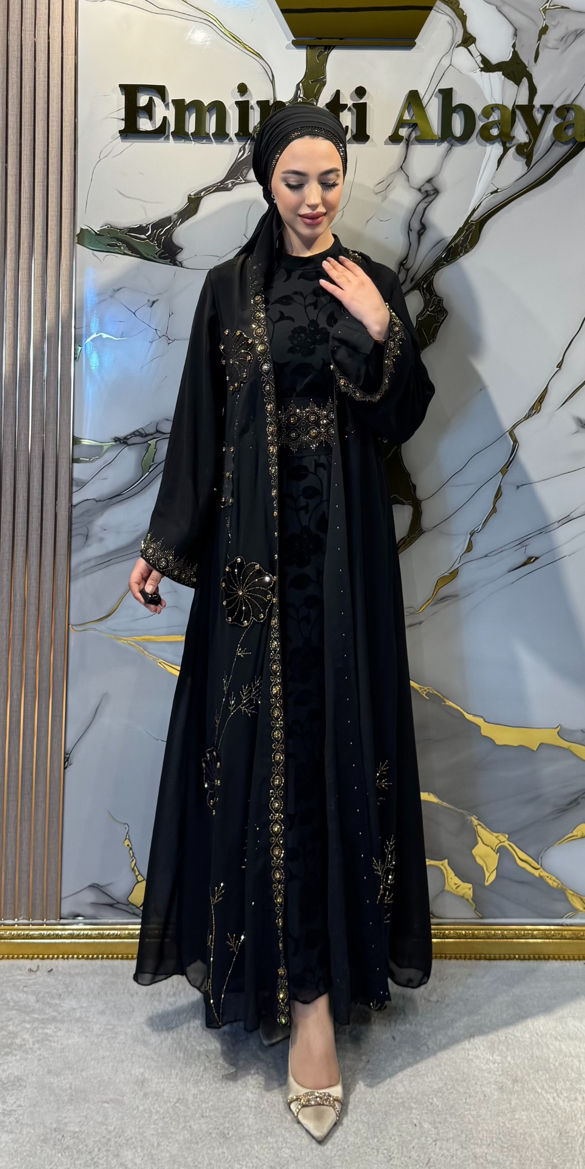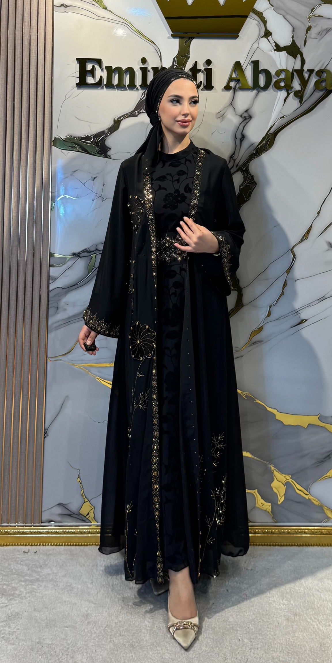 Zarif detaylarla tasarlanan bu abaya seti, flok iç elbise, altın renk çakma ve Swarovski taş işlemeleri ile lüks bir görünüm sunar. Hafif ve akıcı şifon kumaşı, şıklığı konforla birleştirirken altın taşların ışıltısı tasarıma göz alıcı bir dokunuş katar.