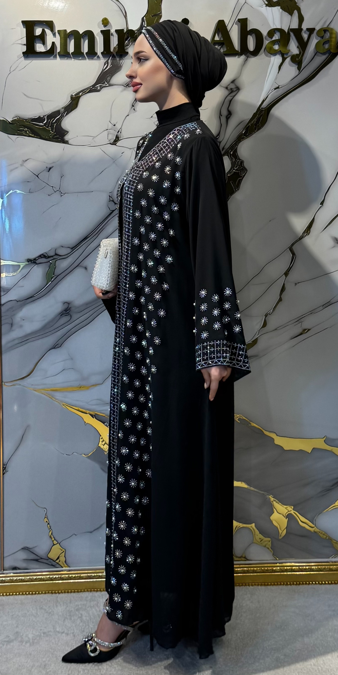 عباية سوداء مرصعة بأحجار سواروفسكي في الأمام