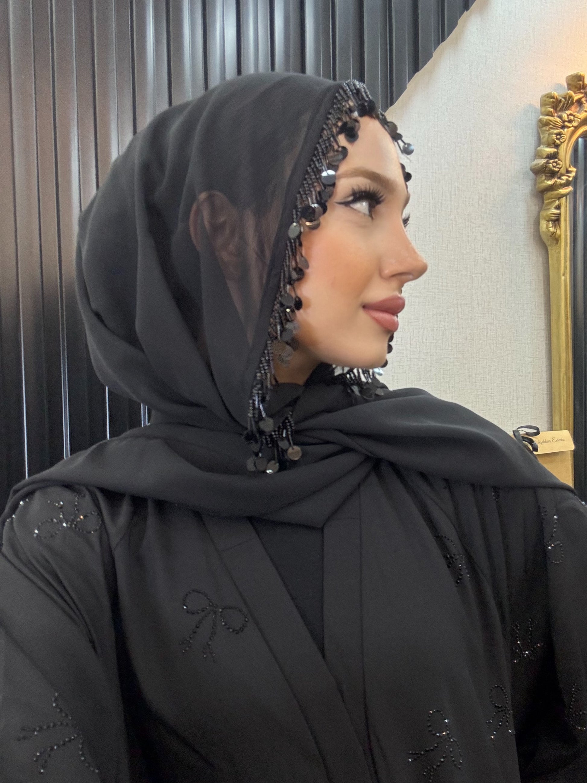 Uç kısımları sallantılı siyah taşlarla süslenmiş şifon siyah şal. Abayalarla mükemmel uyum sağlar.