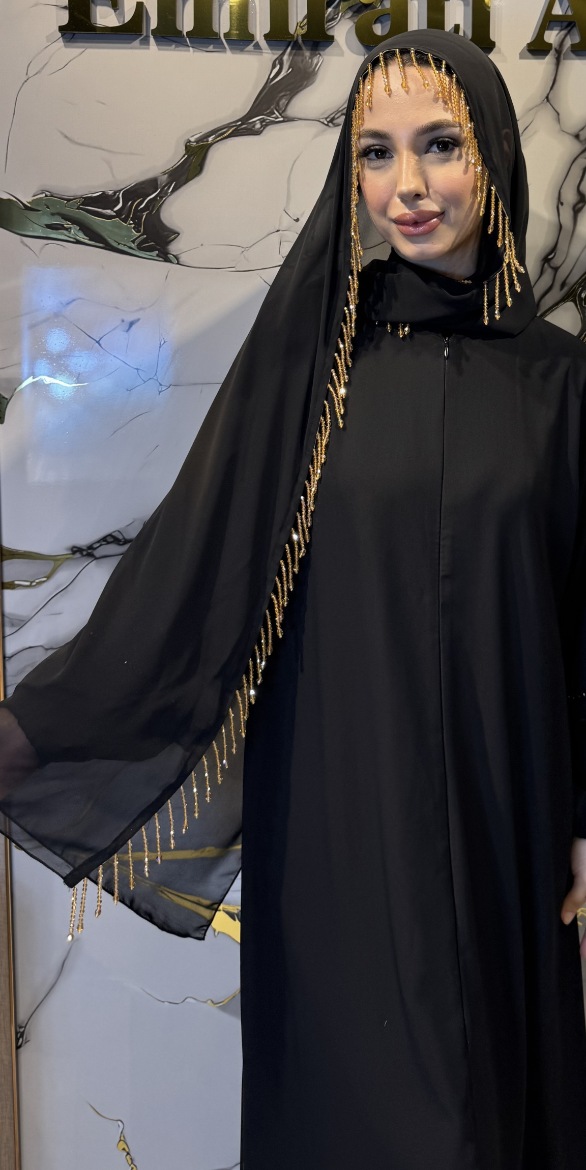 Premium siyah Kore şifon kumaşı (180cm x 75cm) ve uzun altın taş detaylarıyla abayanızı tamamlayan bu zarif şal, stilinize lüks bir ışıltı katacak.