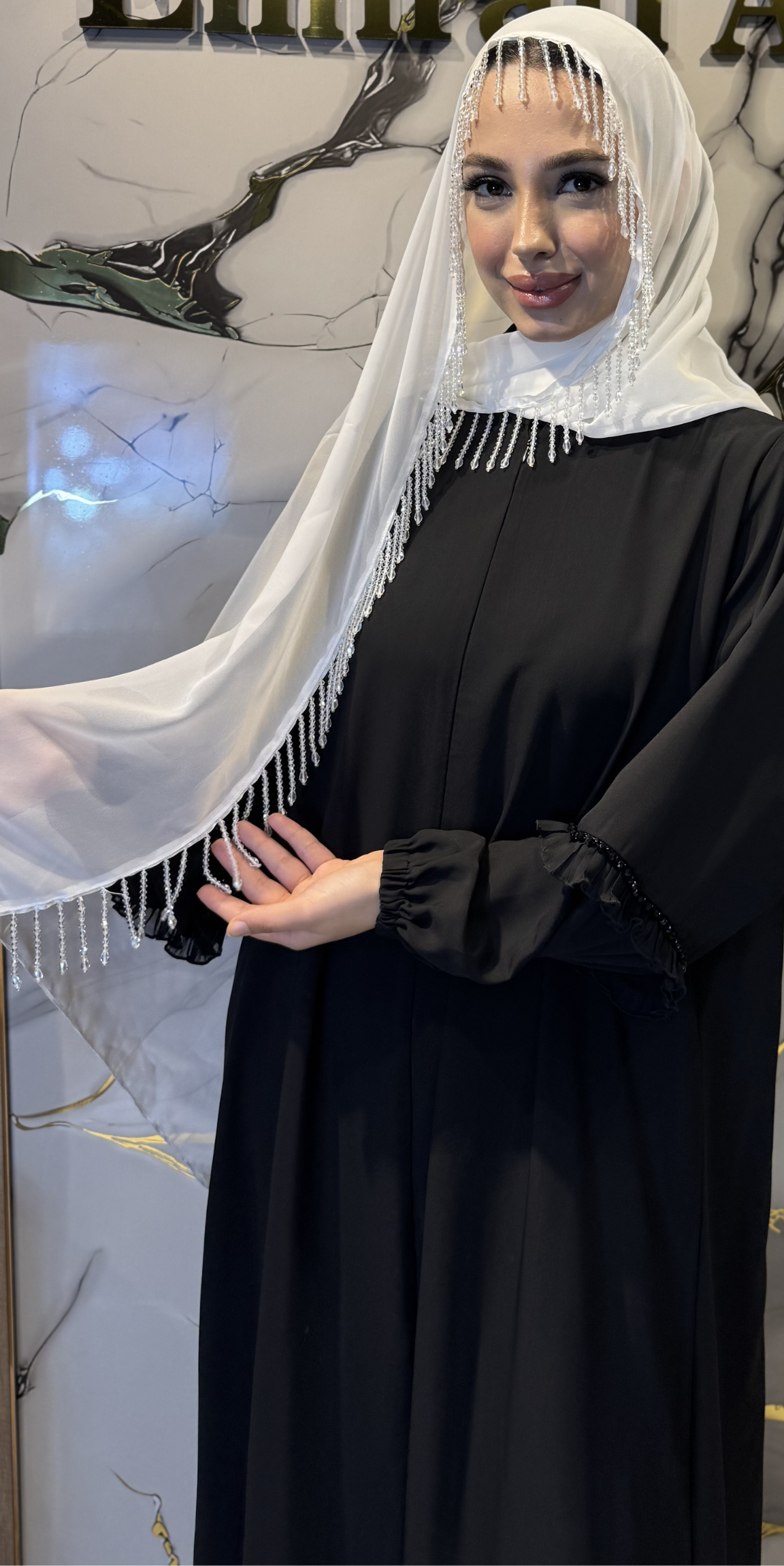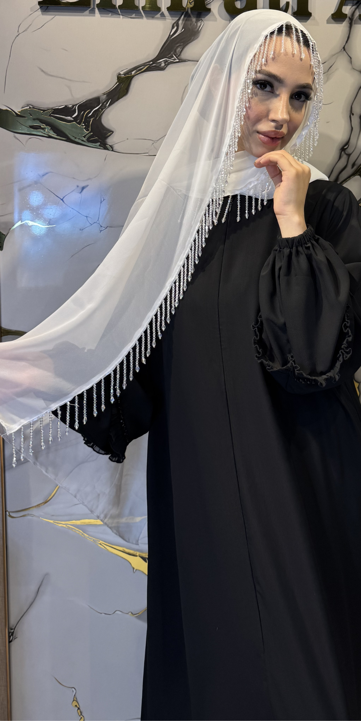 Premium beyaz Kore şifon kumaşı (180cm x 75cm) ve uzun parlak beyaz taş detaylarıyla abayanızı tamamlayan bu zarif şal, stilinize ışıltılı bir dokunuş katacak.