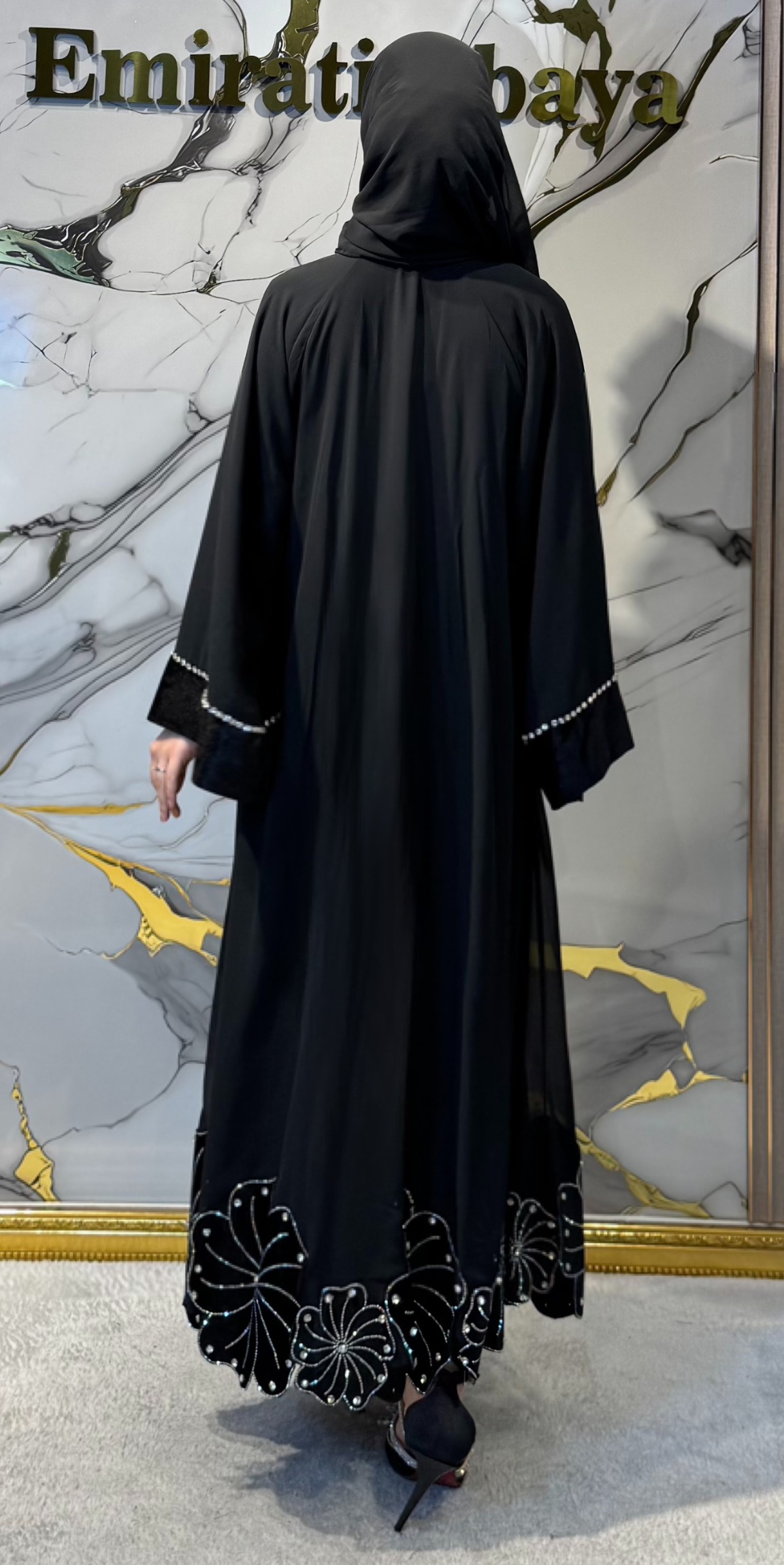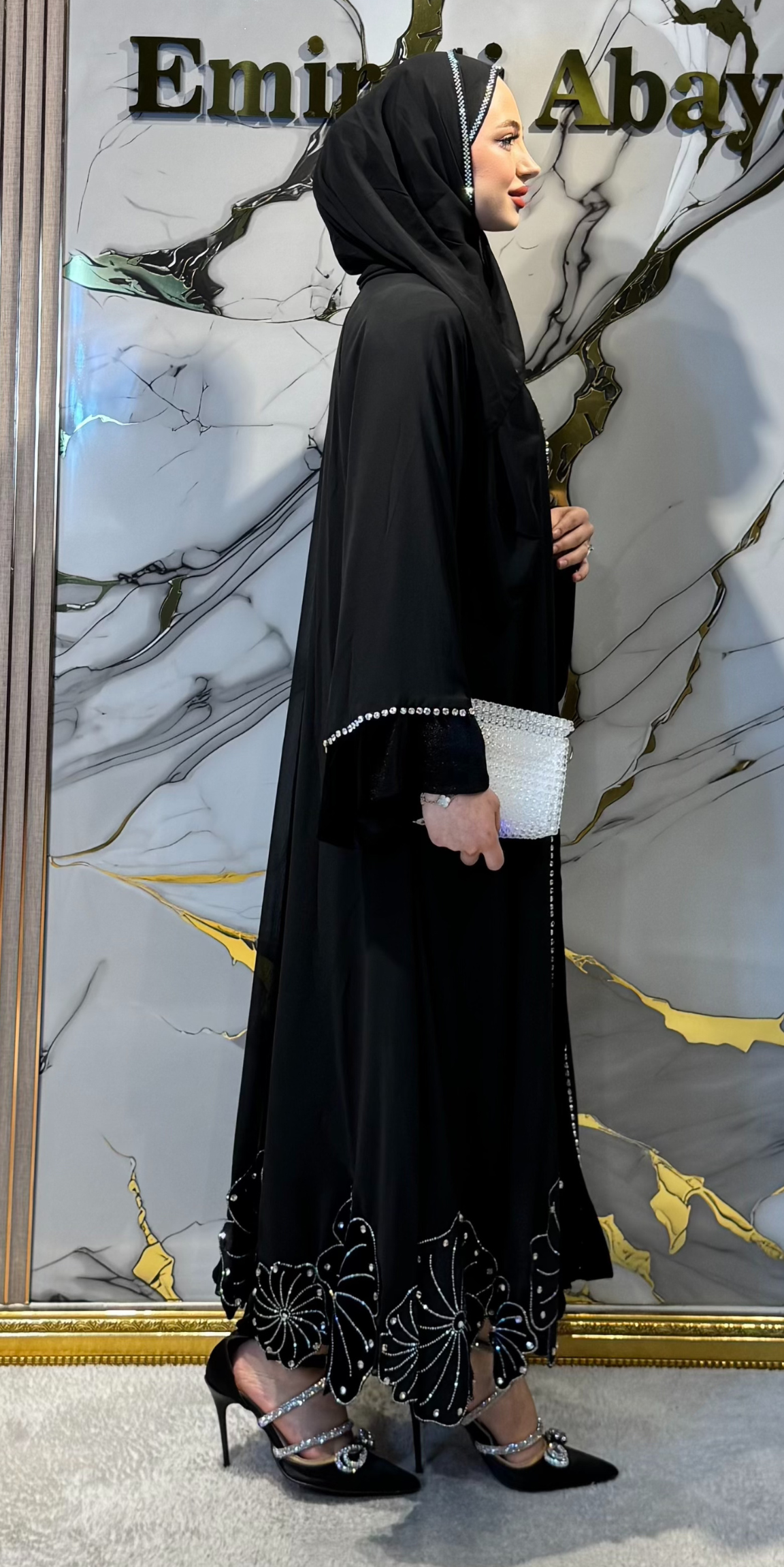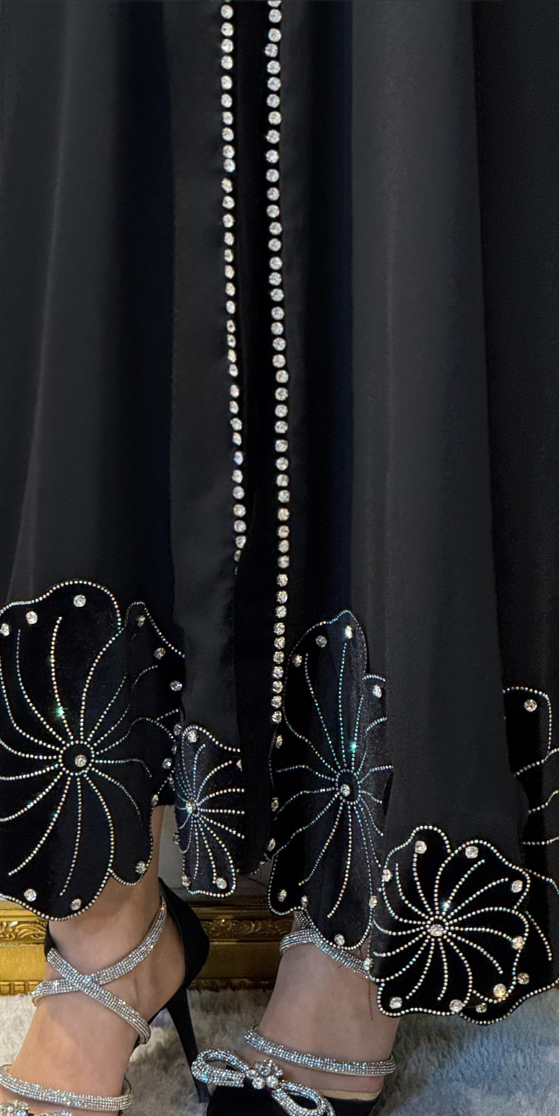 عباية سوداء بأحجار سواروفسكي – تصميم خاص بنقشة زهور أنيقة