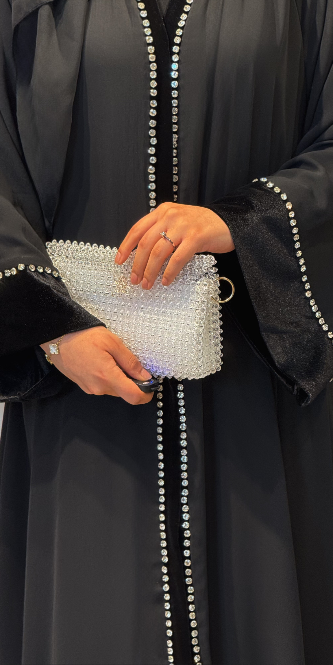 هذه العباءة السوداء، حيث تلتقي الأناقة بالبساطة، تقدم مظهرًا متألقًا مع تطريز أحجار سواروفسكي على الجهة الأمامية والأكمام. تضفي الأنماط الزهرية الكبيرة على الحافة لمسة فنية على الموديل، في حين أن تصميمها الواسع وبنيتها المتدفقة تناسب جميع أحجام الجسم. مُصمم خصيصًا لأولئك الذين يبحثون عن أسلوب بسيط ومثير للإعجاب في المناسبات الخاصة.