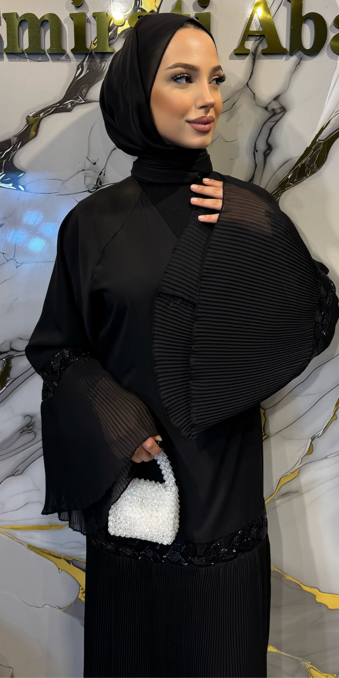Piliseli Tasarım: Tüm abaya boyunca zarif piliseler El işlemeli boncuk detayları Sofistike doku Zarifçe hareket
