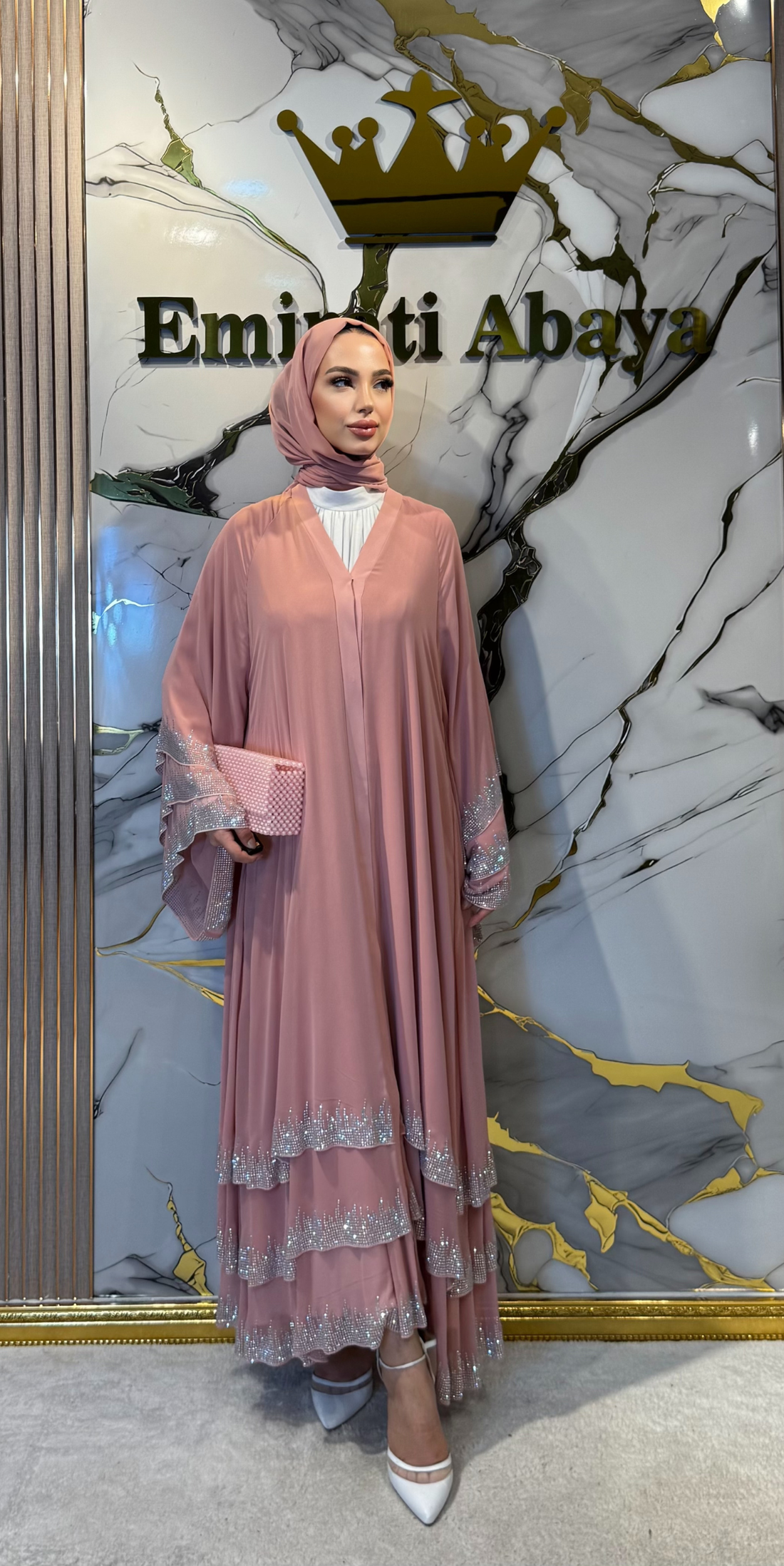 Bu Pembe rengi şifon abaya, üç katlı eteği ve katlı kollarıyla zarafeti yansıtıyor. Janjan taşlarla...