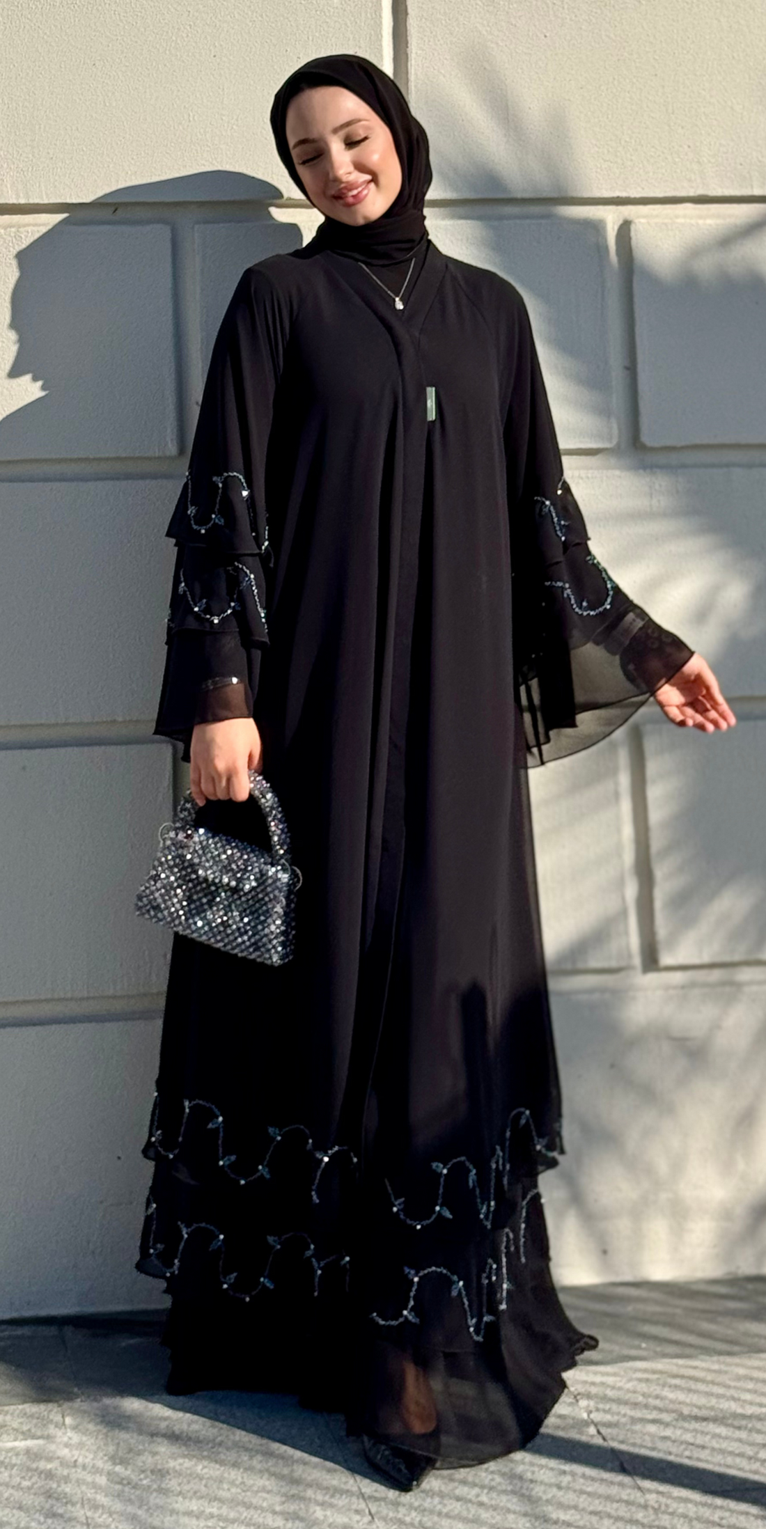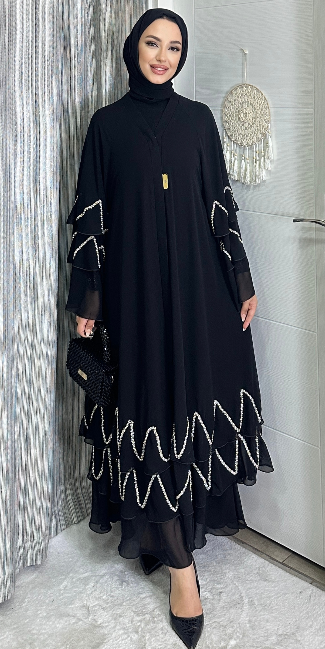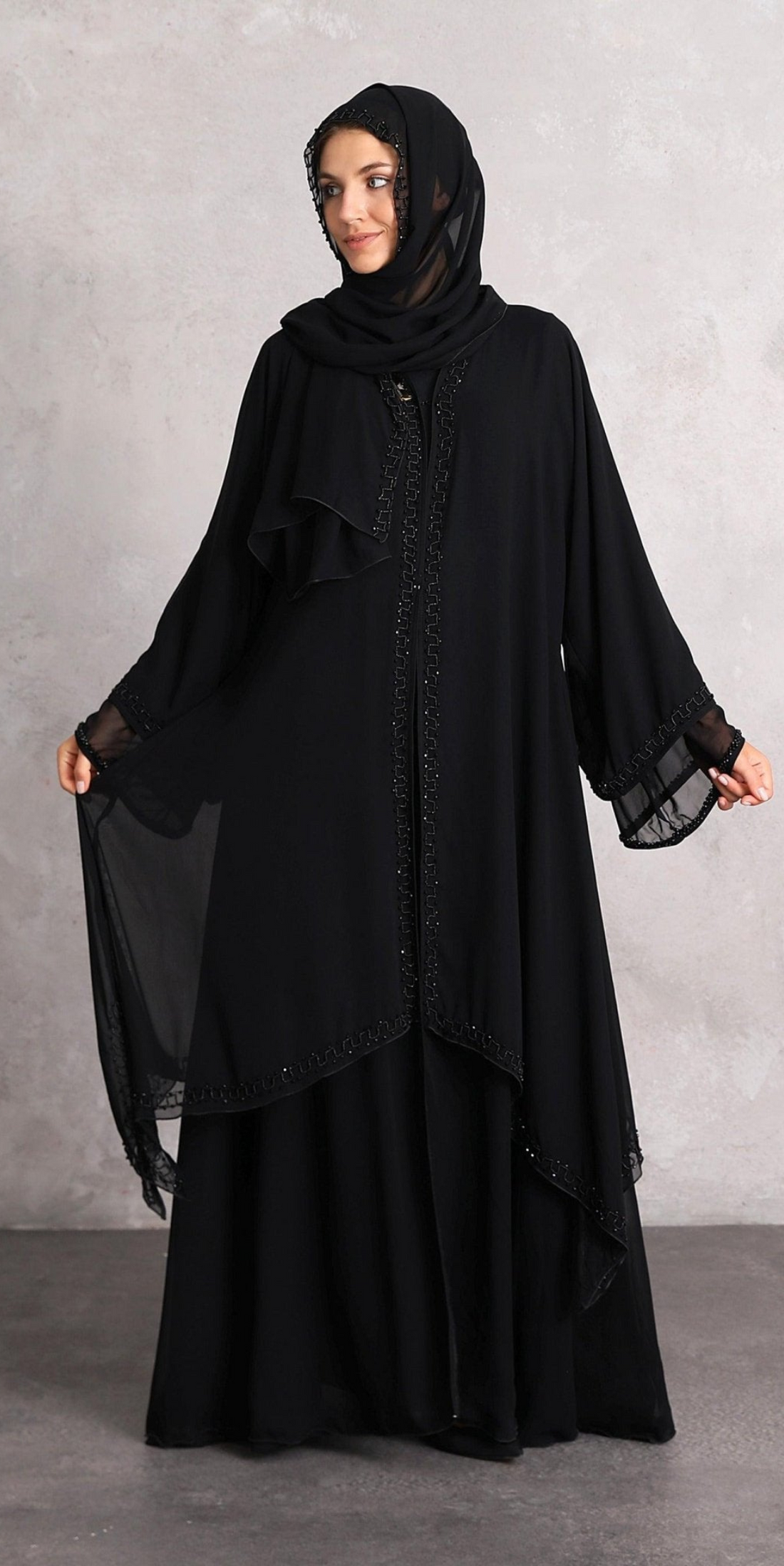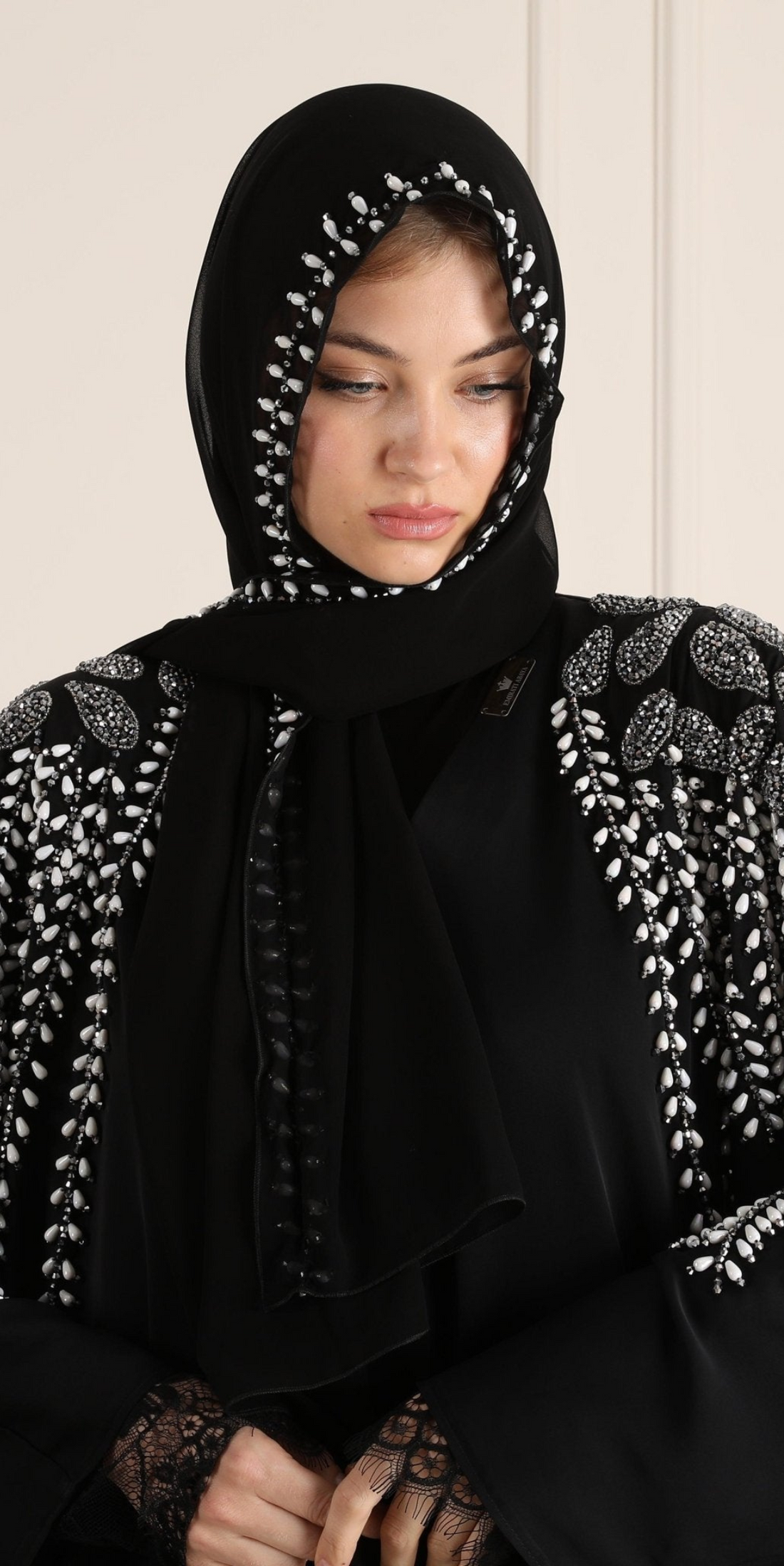 Zarif Taşlarla El İşlemesi Siyah Şifon Abaya