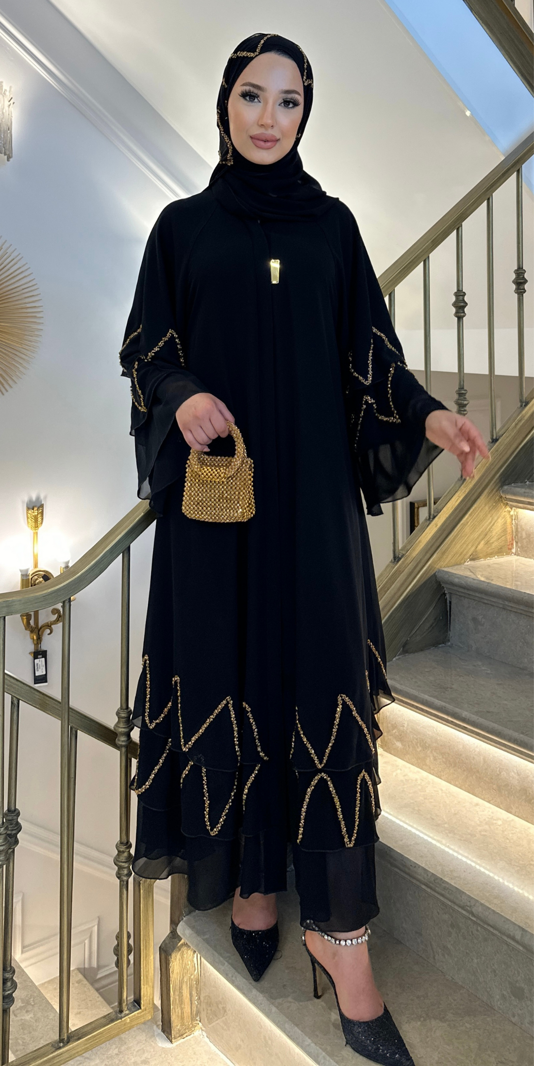 Omuzları El İşlemeli Gold Taşlı Siyah Abaya