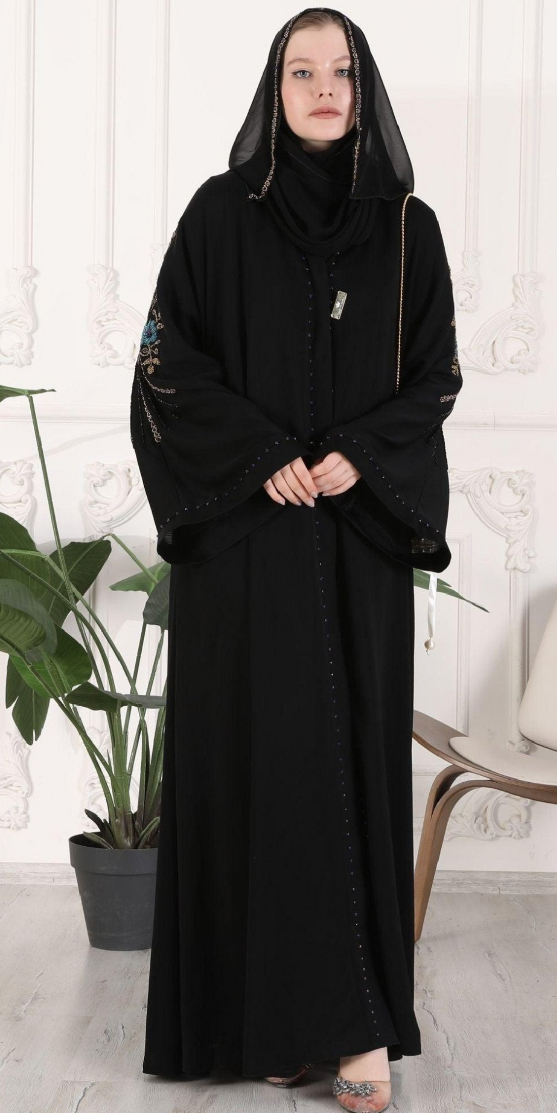 Yanları El İşlemeli Siyah Taşlı Abaya