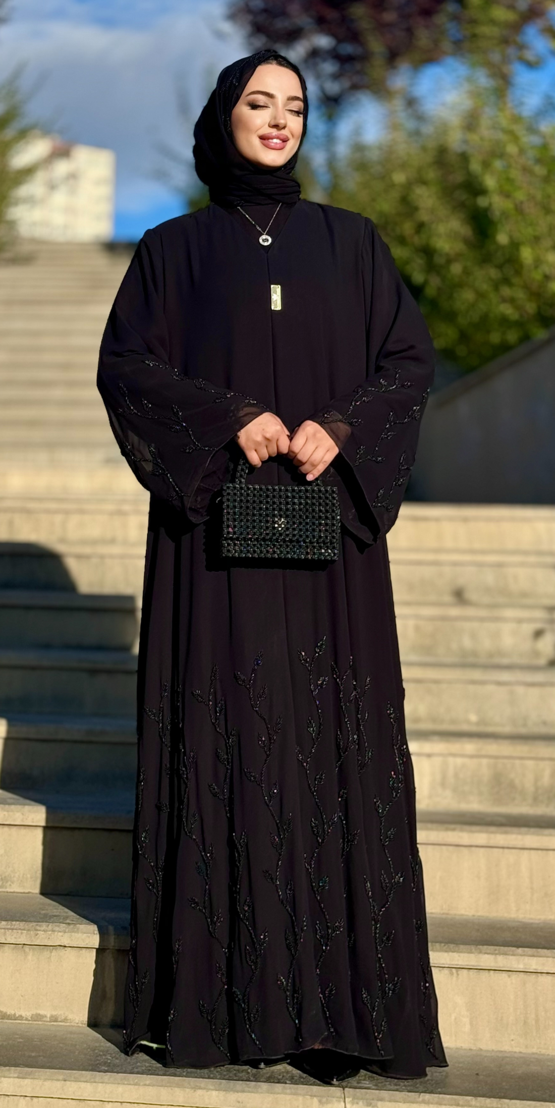 El İşlemeli Dallı Dubai Tarzı Siyah Abaya