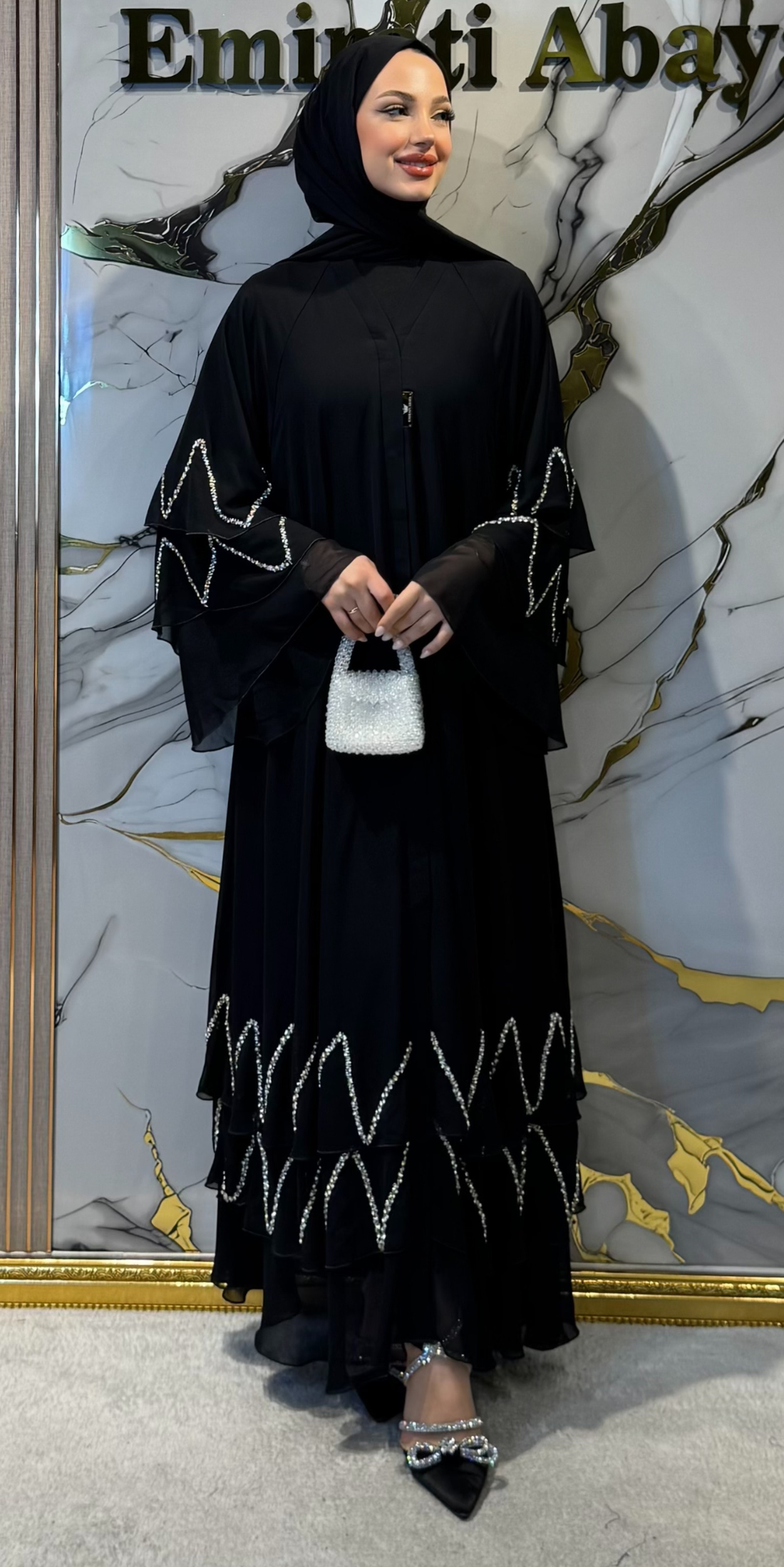 Üst kısmı taşlarla ve incilerle süslenmiş şık siyah abaya, zarif görünümü ile dikkat çeker. Hafif...