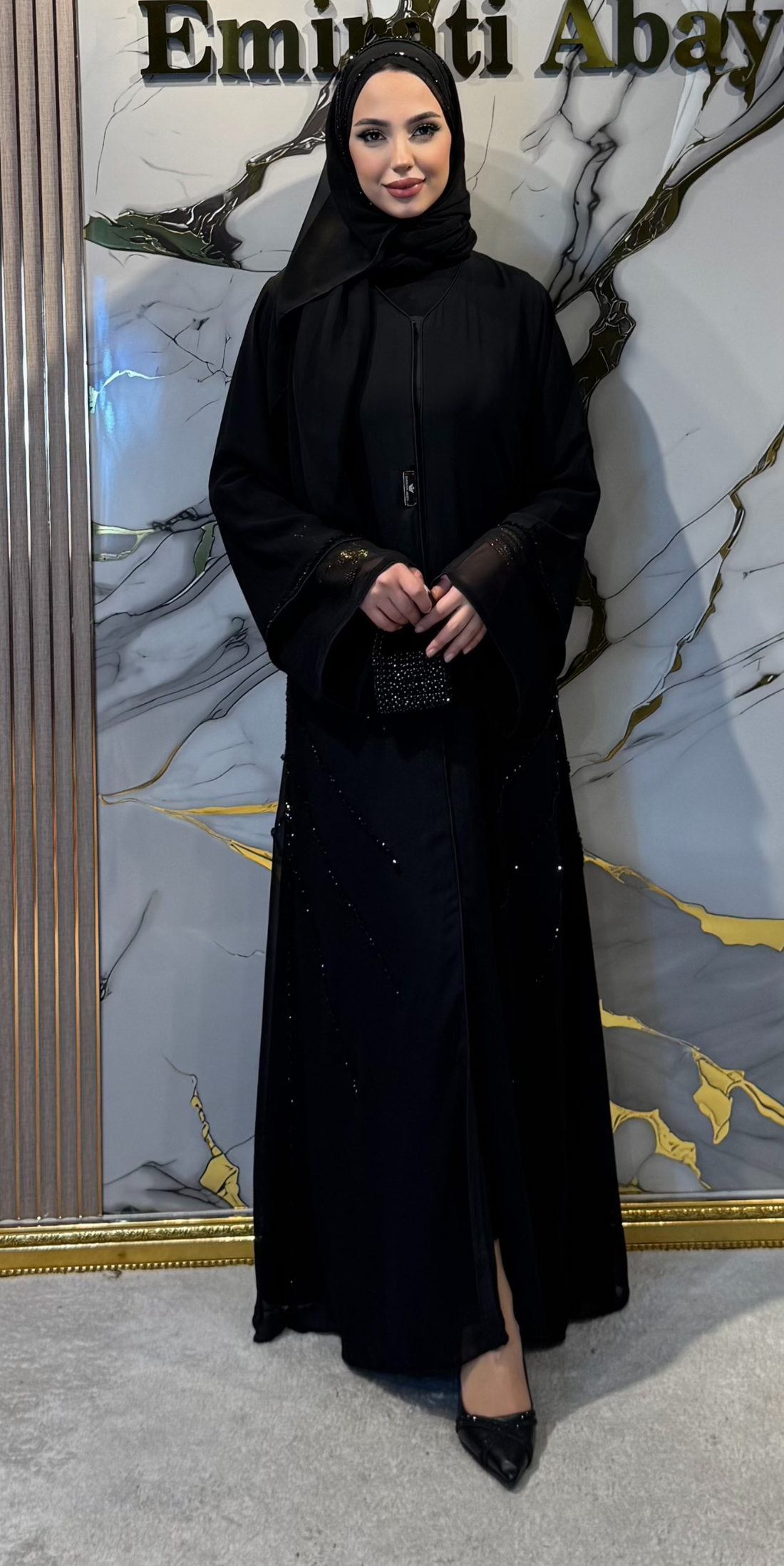 Zarafet ve ince işçiliğin buluştuğu lüks siyah şifon abaya. El emeği ile işlenmiş siyah taş...