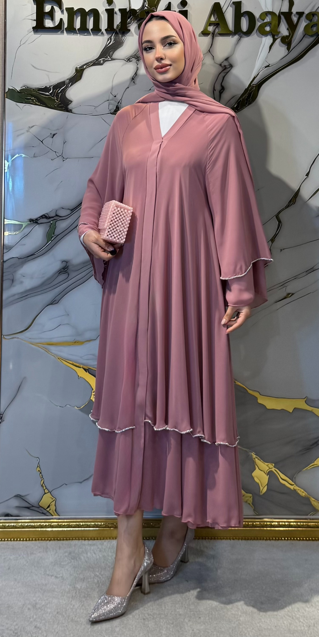 Premium pembe kumaştan üretilmiş iki katlı abaya ile zarafeti ve lüksü bir araya getirin. Swarovski...