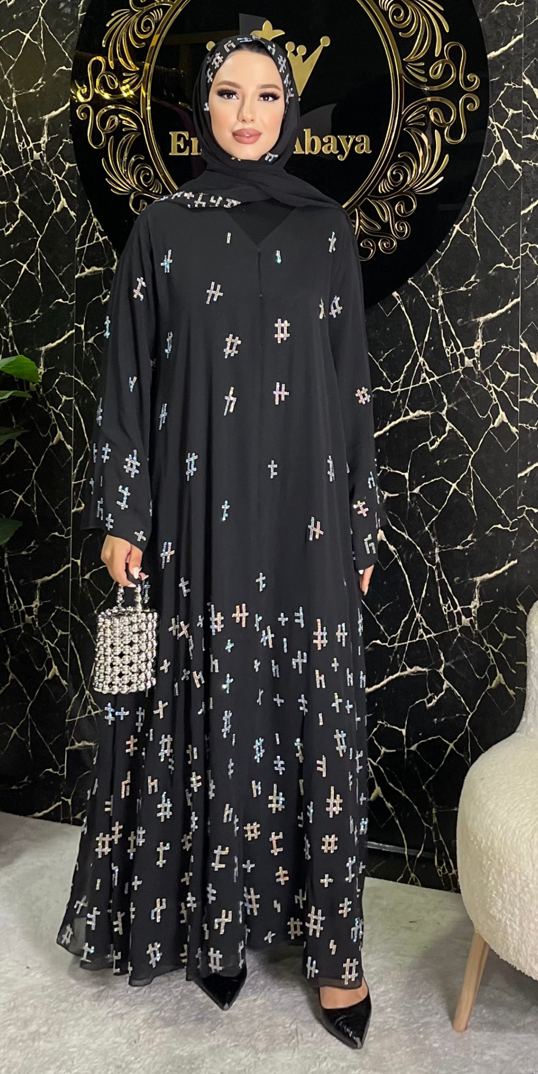 Zarif detaylarla tasarlanan bu siyah şifon abaya, "Vals Deseni" olarak adlandırılan özel yapışkan taş motifleriyle...