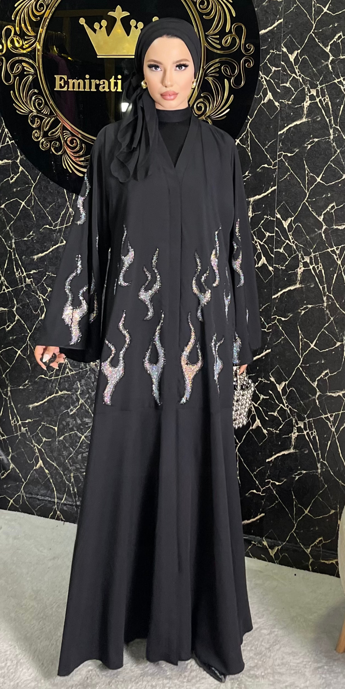 Ön ve kollarda ateş desenli janjan taşlarla dikkat çeken bu siyah abaya, kaliteli Dubai kumaşıyla...