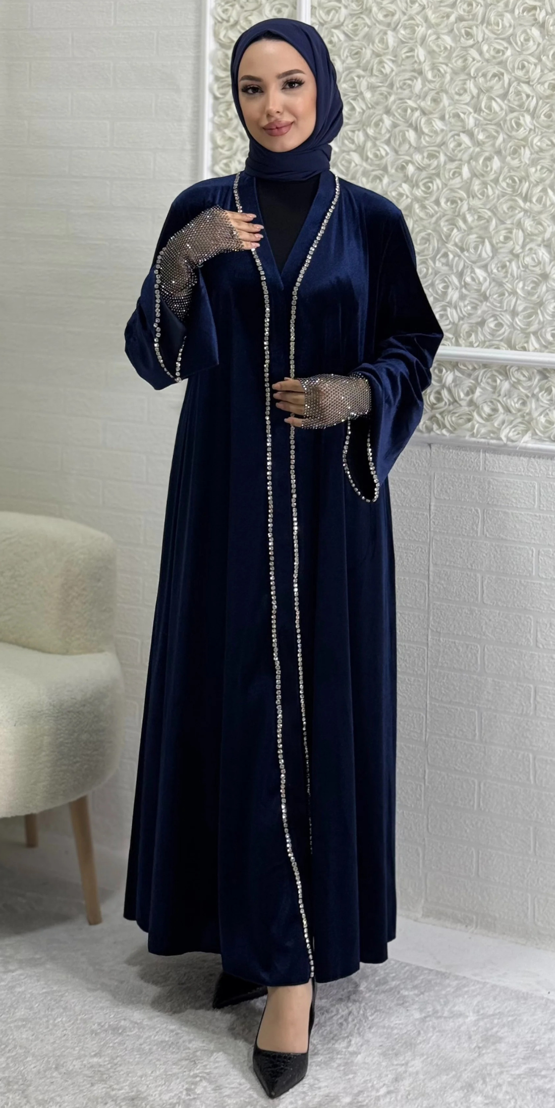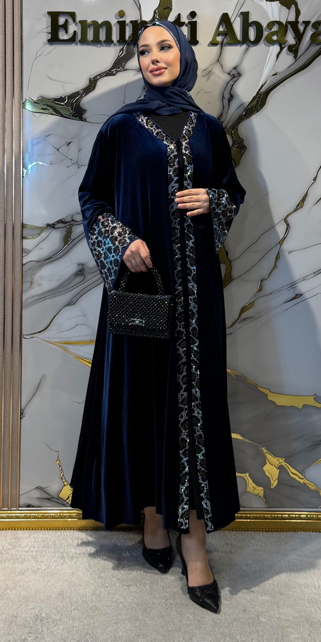 This special navy abaya, crafted with the elegance of velvet fabric, offers a dazzling touch...