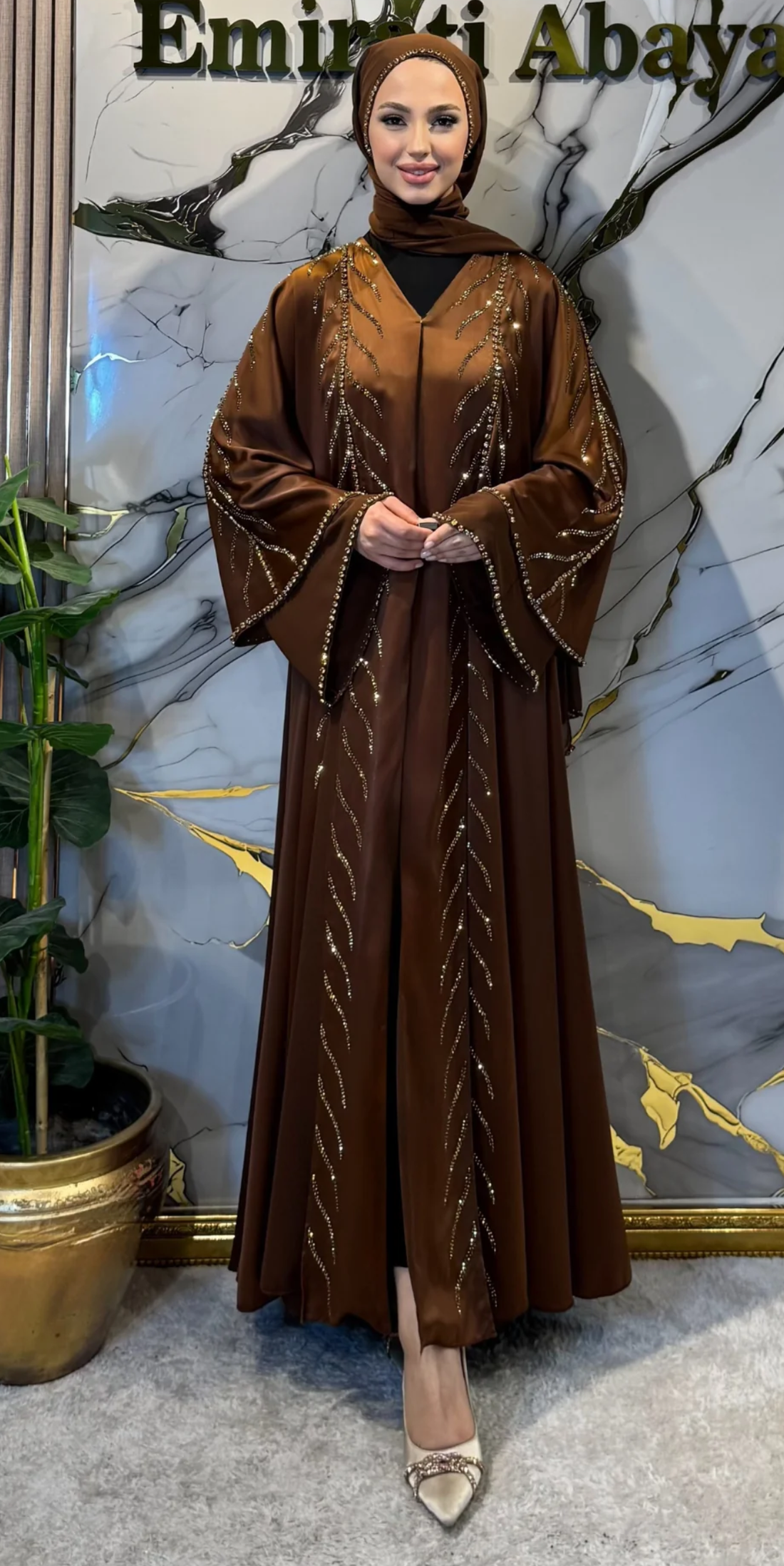 Our elegant abaya collection adorned with sparkling stone details. Luxurious designs for your special occasions, featuring Swarovski, glitter, gold, and rhinestone stones.