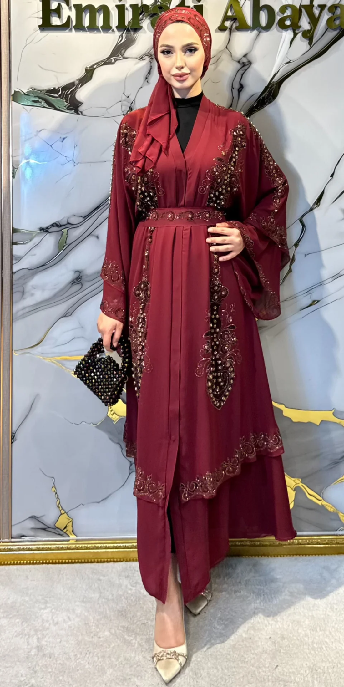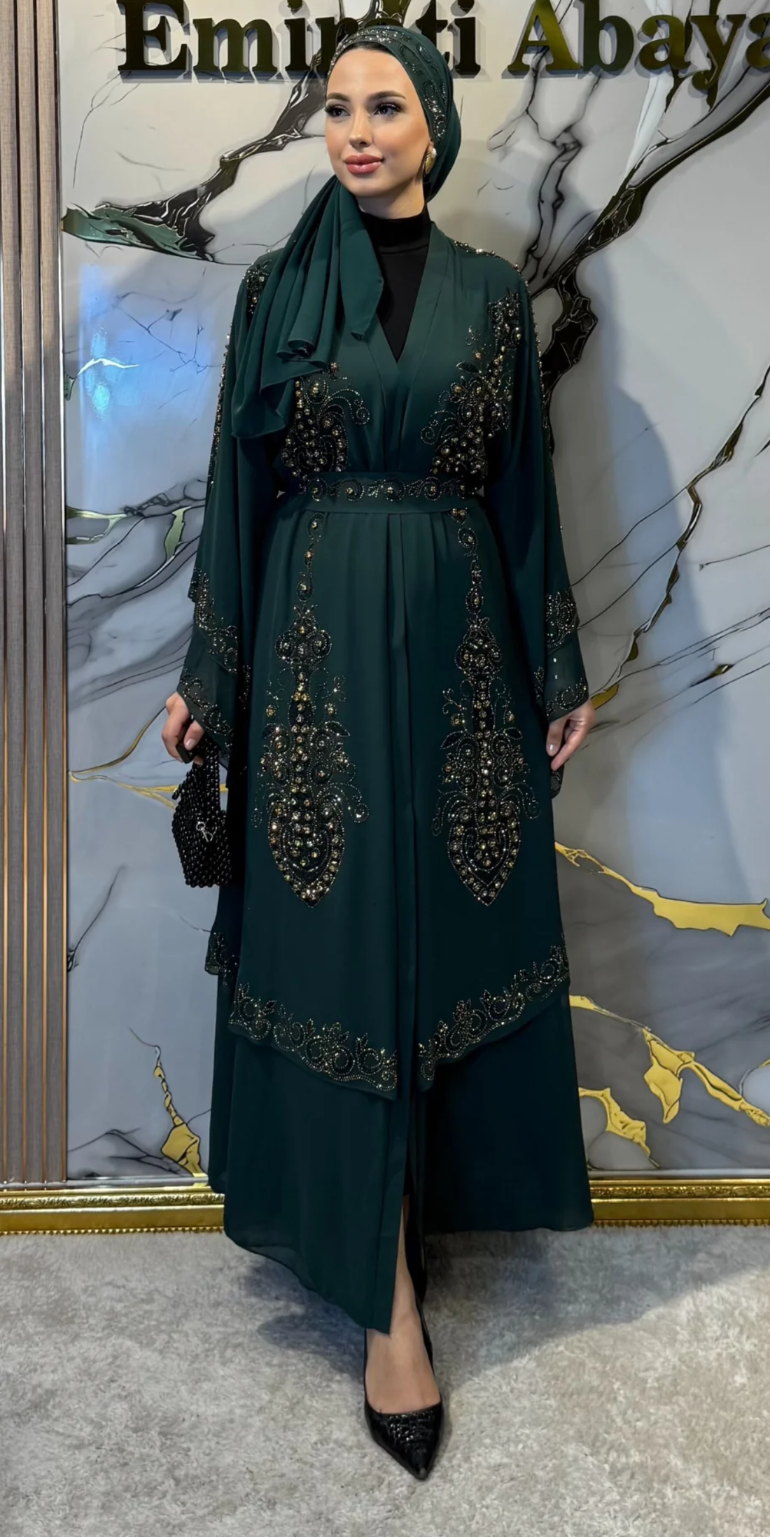 Our elegant abaya collection adorned with sparkling stone details. Luxurious designs for your special occasions, featuring Swarovski, glitter, gold, and rhinestone stones.
