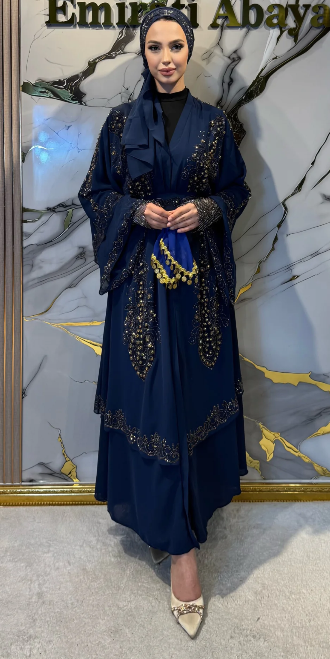 Double Layer Navy Blue Chiffon Abaya LY14 GSL with Gold Embellishments - Includes Embellished Belt and Shawl