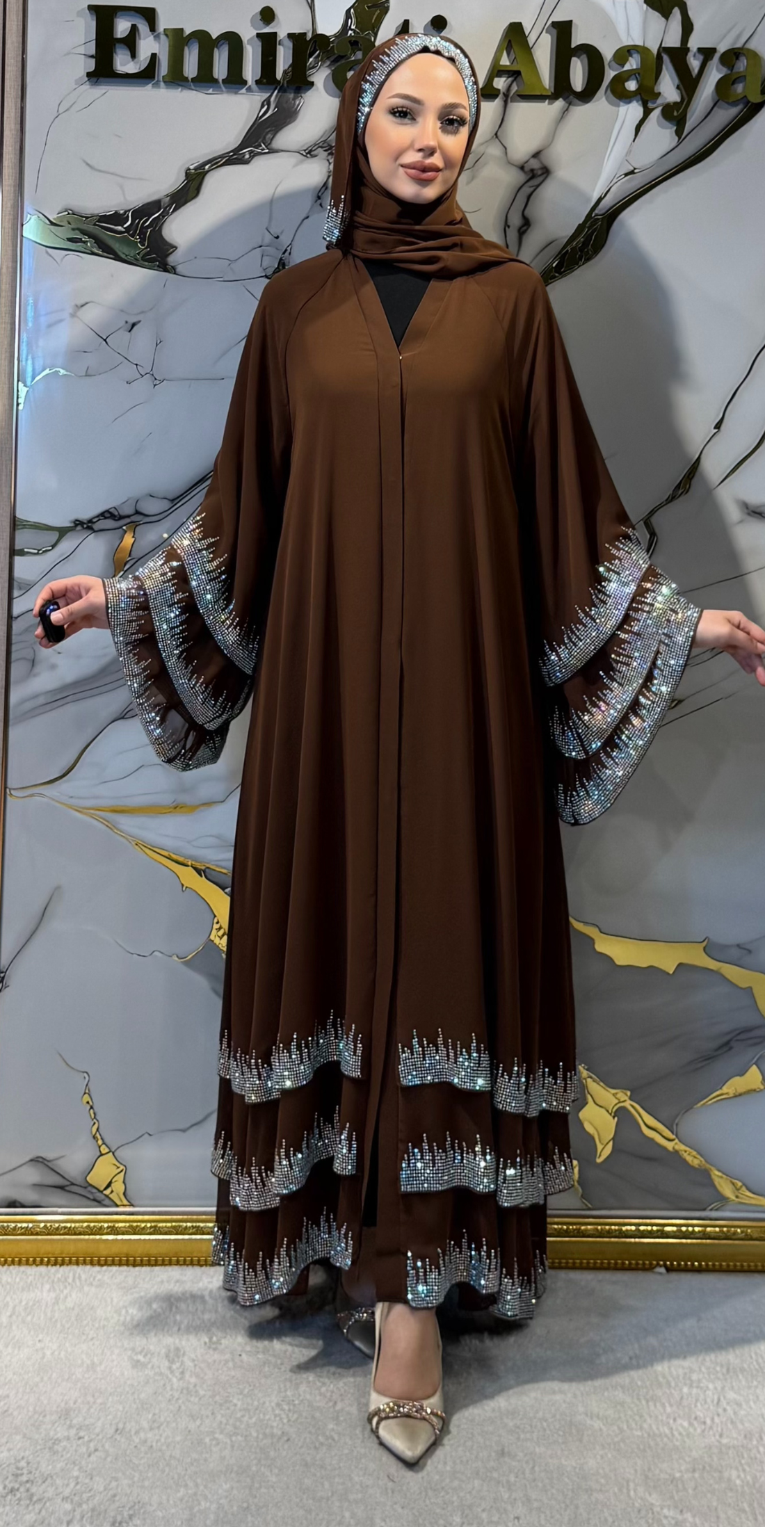 Brown Three-Layer Abaya Embellished with Swarovski Crystals - Luxury Chiffon Model TM22 JS BROWN
