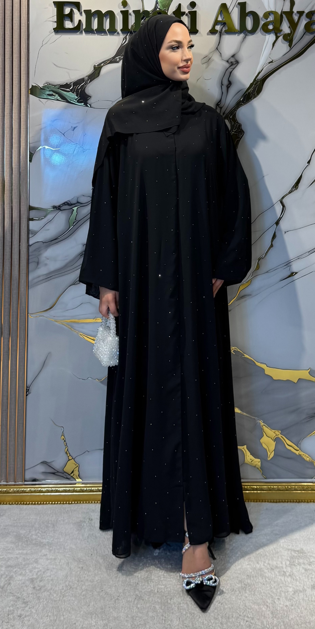 Our elegant abaya collection adorned with sparkling stone details. Luxurious designs for your special occasions, featuring Swarovski, glitter, gold, and rhinestone stones.