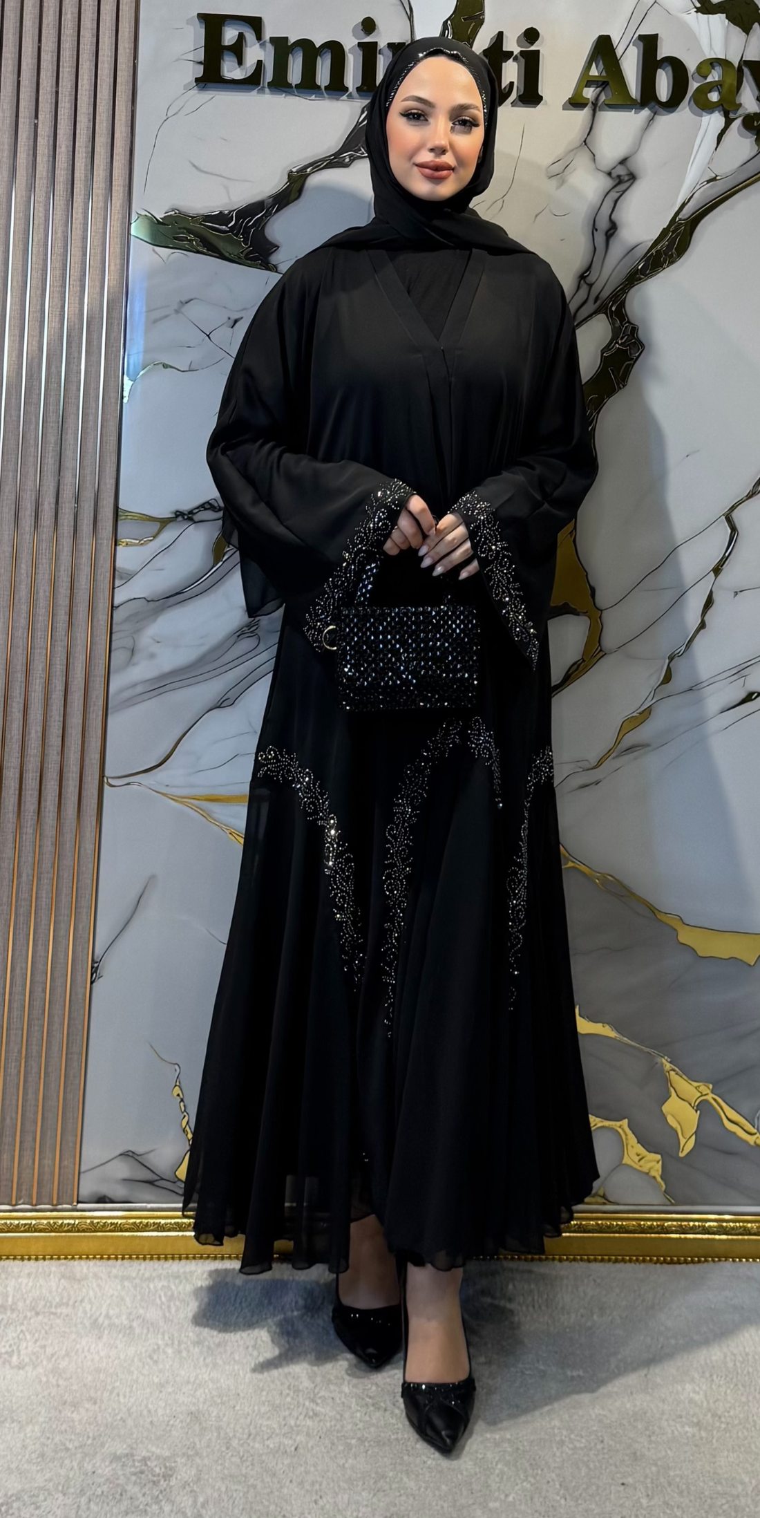 An elegant, three-layered, custom-designed abaya in black. Each layer features white stone details, and the...