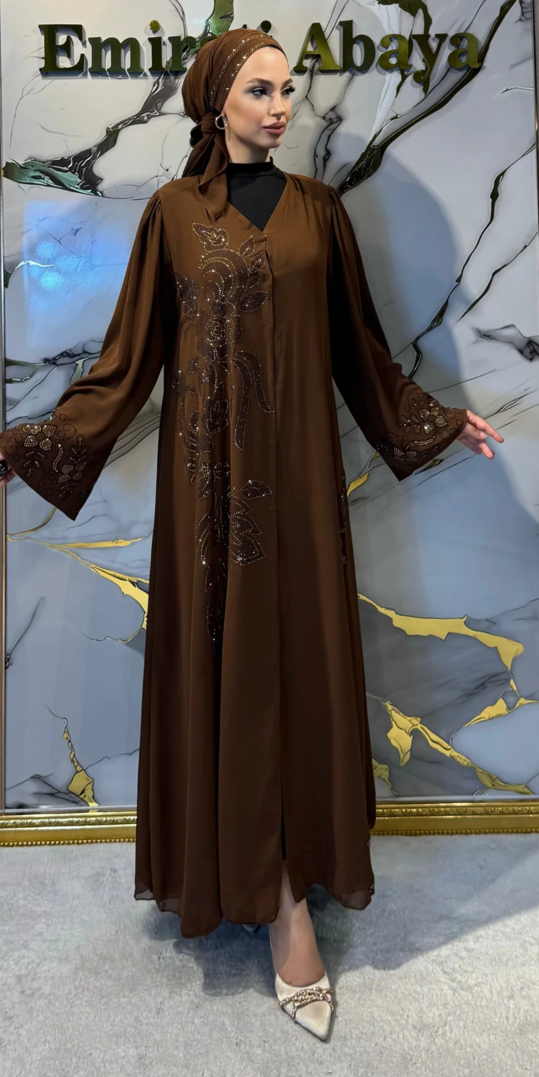 Brown Chiffon Abaya with Gold Stone Embellished Floral Pattern and Button Front Closure | TM70 GS BROWN