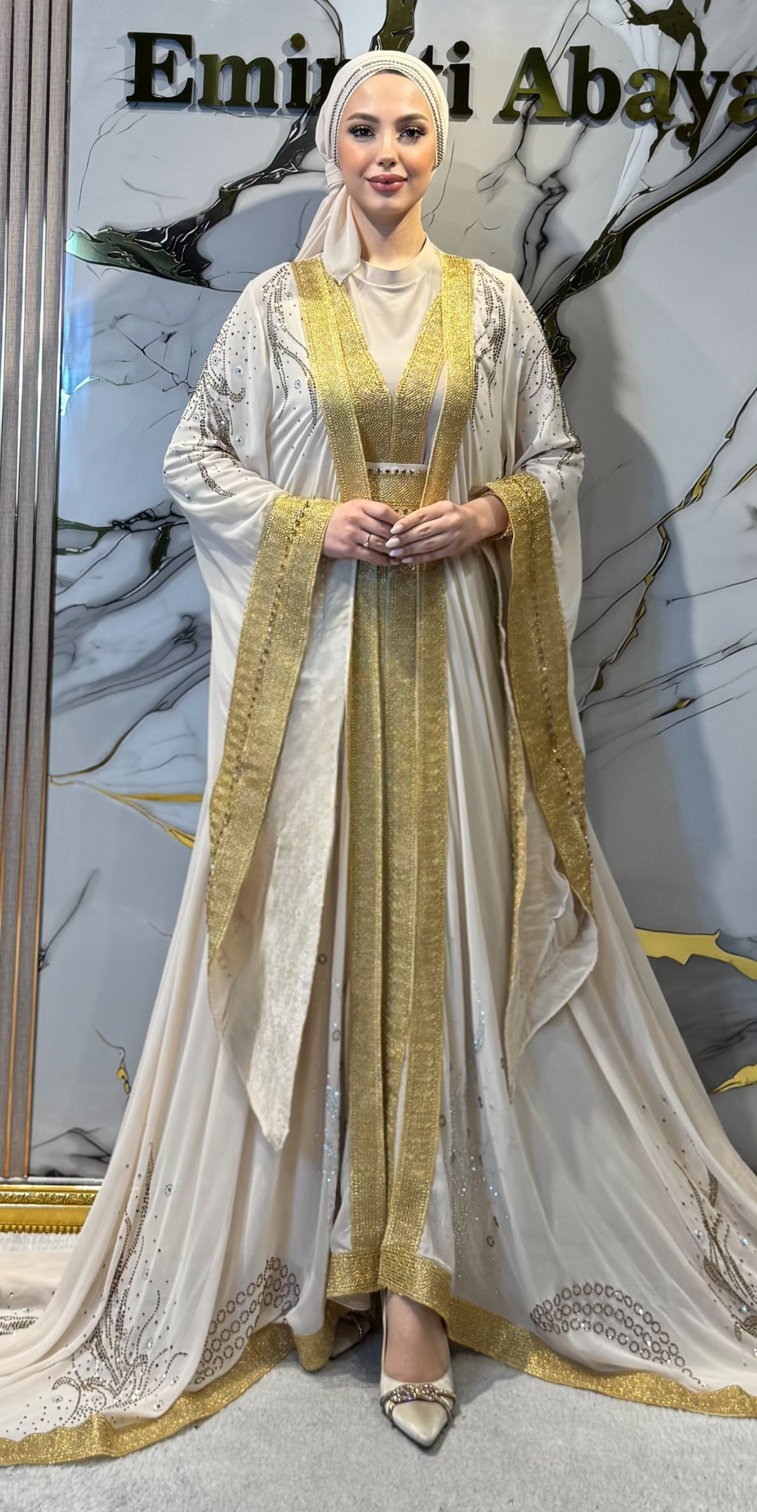 This custom-designed abaya set is crafted with a chiffon outer layer and a sandy inner...