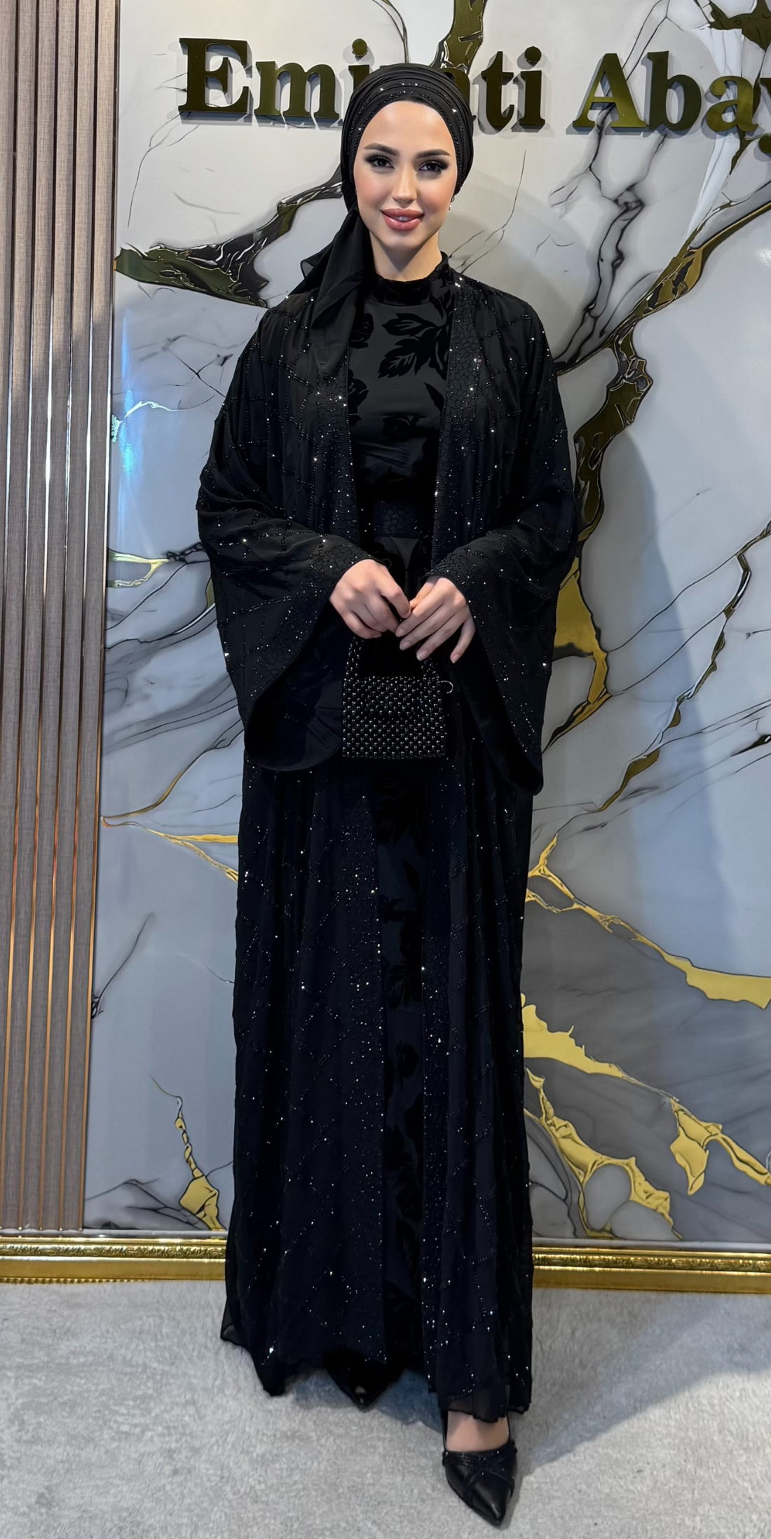 High-quality Korean chiffon Dubai-style traditional abaya set with hematite-embellished flocked undergarment.