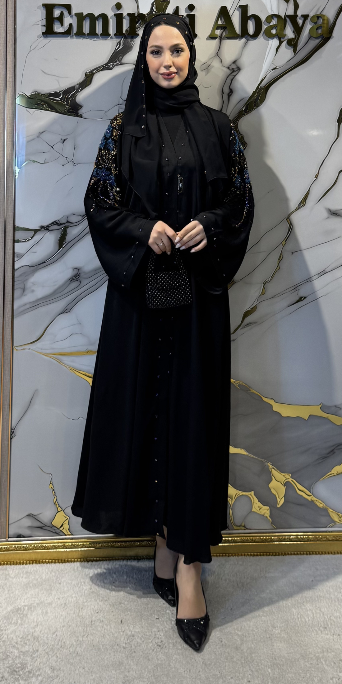 Our hand-embroidered black chiffon abaya with blue stones combines style and elegance. Product Specifications: -...