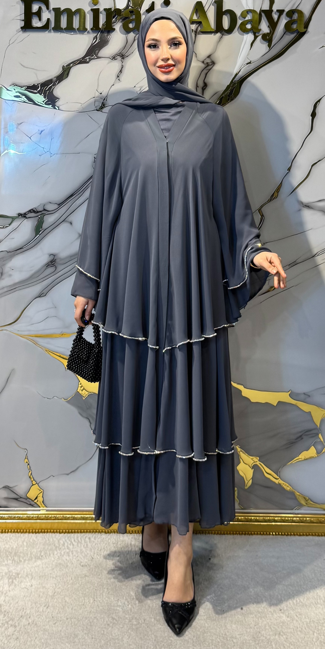 Three-Layer Grey Abaya with Swarovski Crystals RK011 WSG - Elegant Layered Design