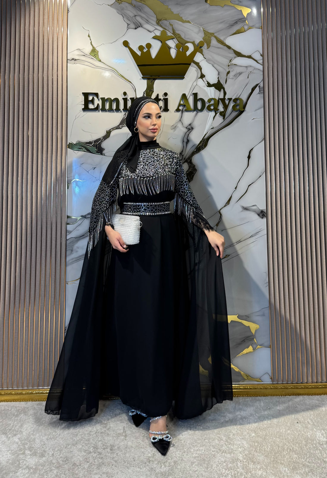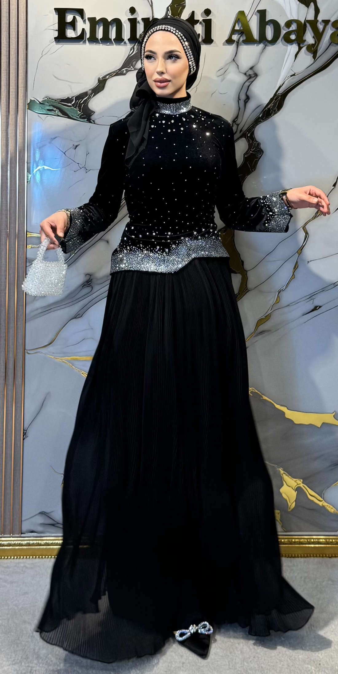 Long-sleeved, handcrafted black velvet abaya with white stones.