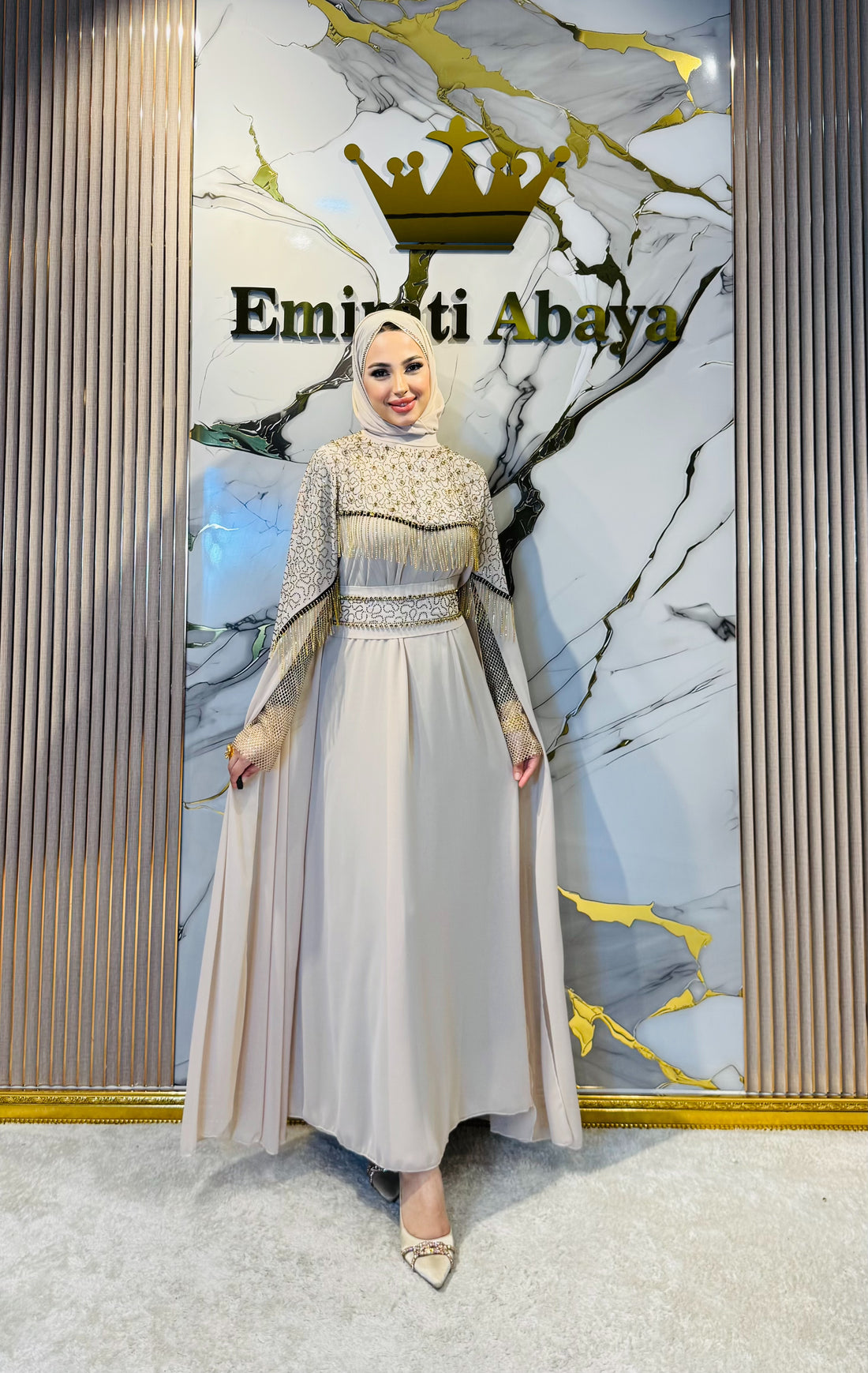 Gold Swarovski Crystal Korean Chiffon Dubai Style Cream Abaya