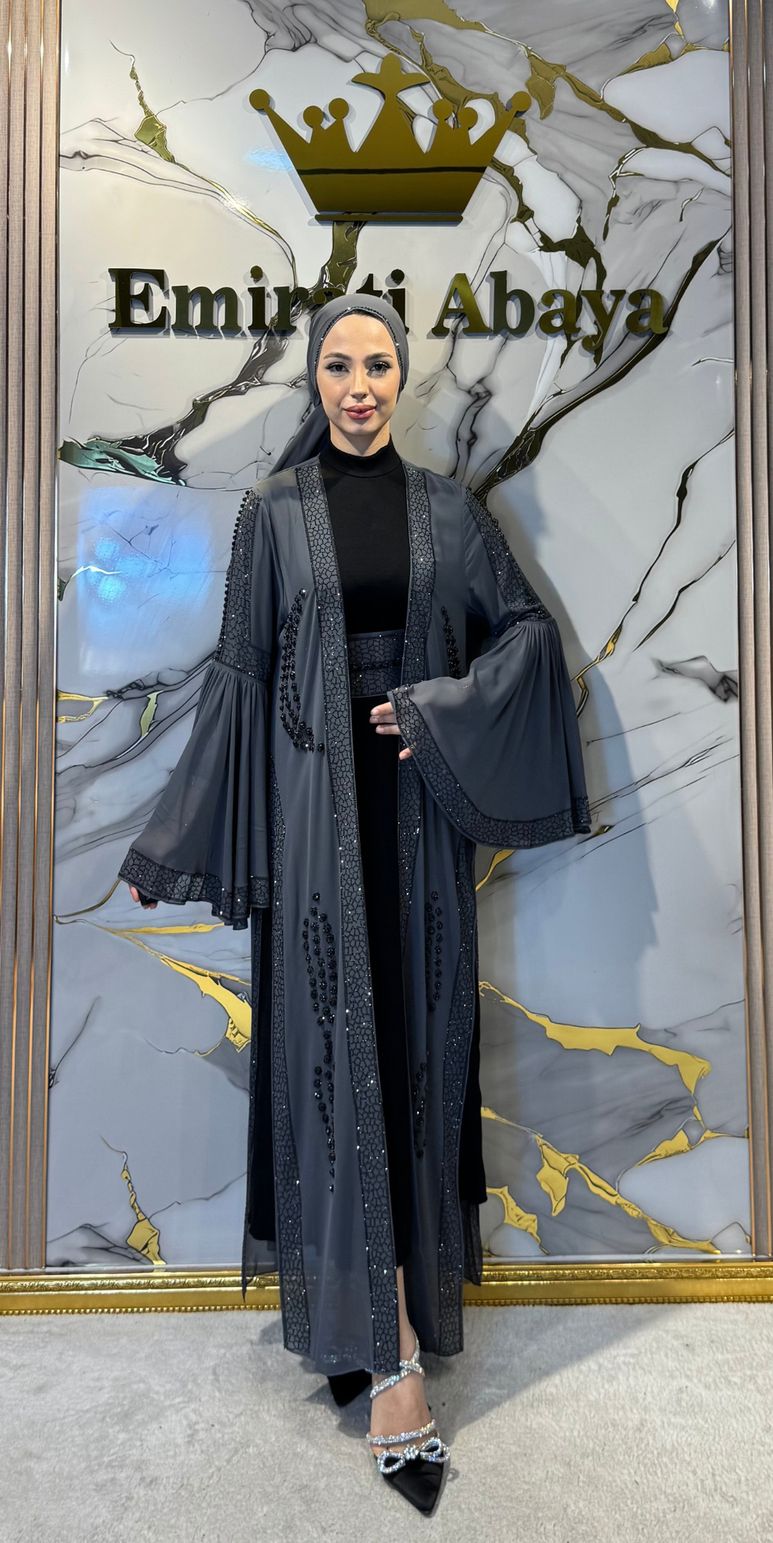 Traditional Abaya with Hematite Stone Embellishments and Tail.