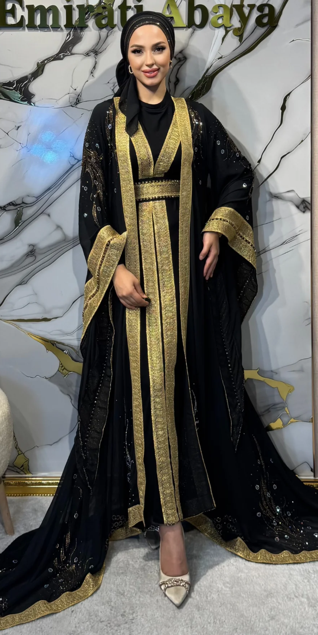 Emirati Gold Swarovski Crystal Embellished Korean Chiffon Abaya LY33 GSB - 4-Piece Luxury Set (Includes Shawl, Belt and Flocked Undershirt)