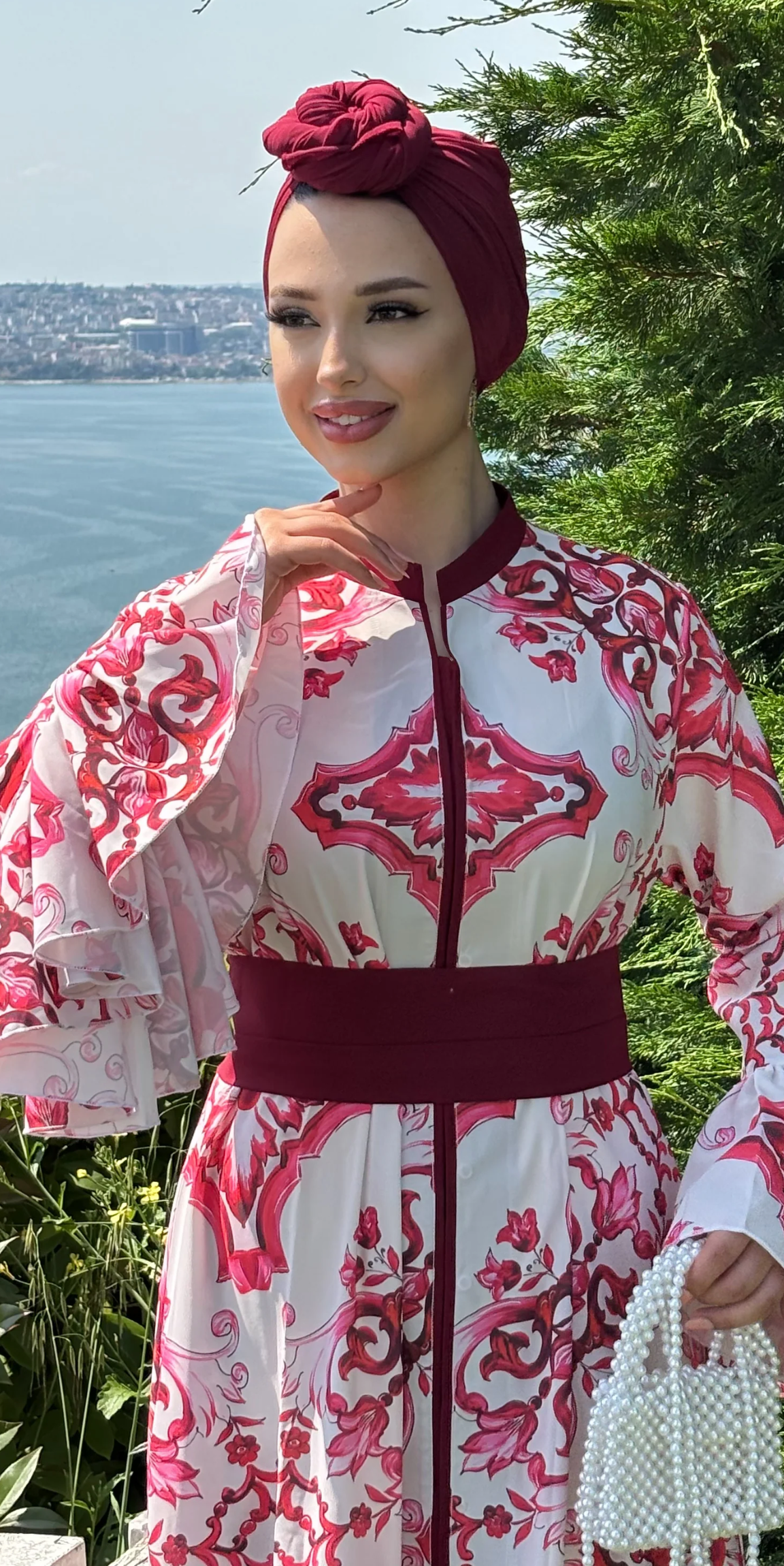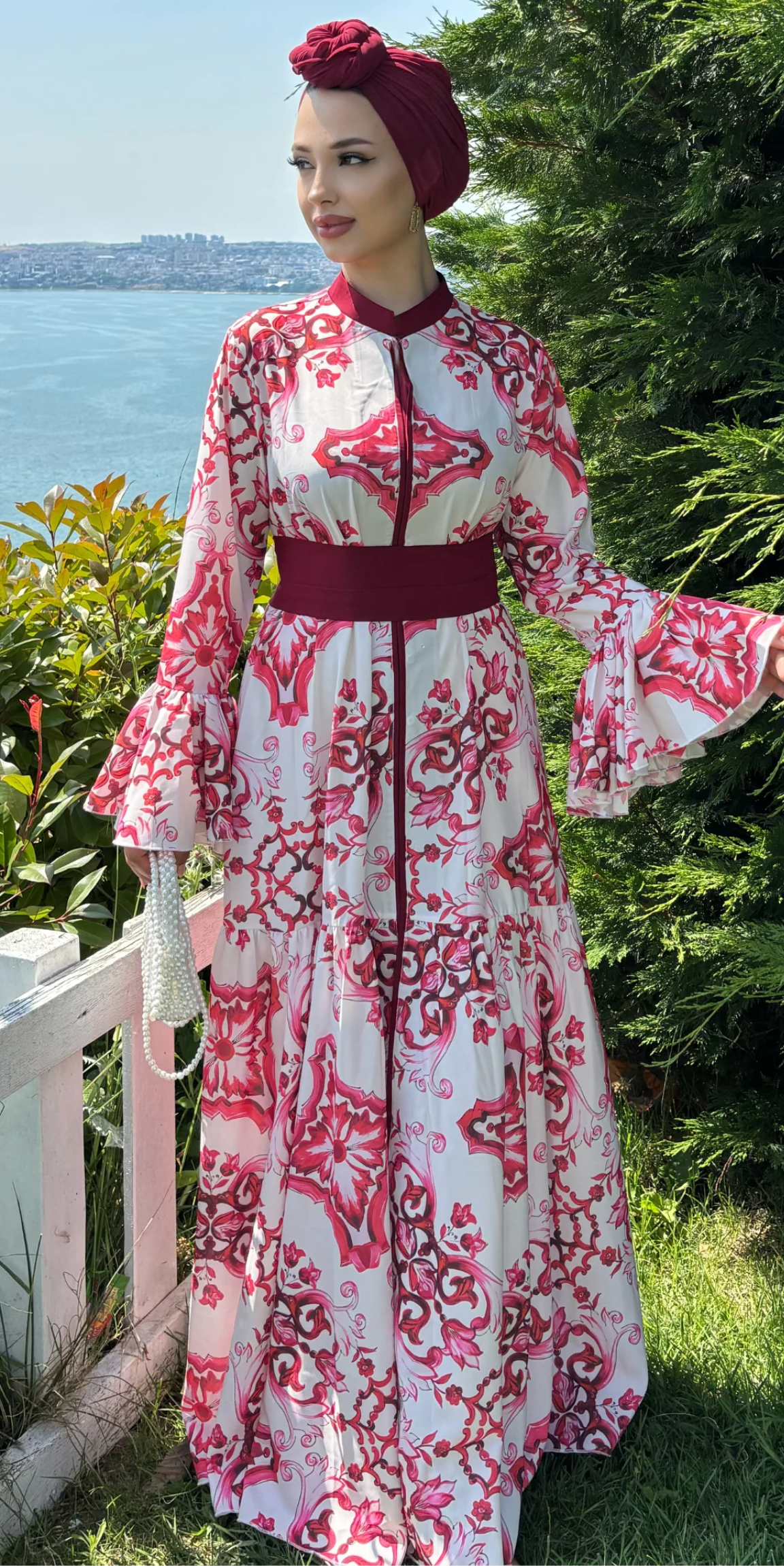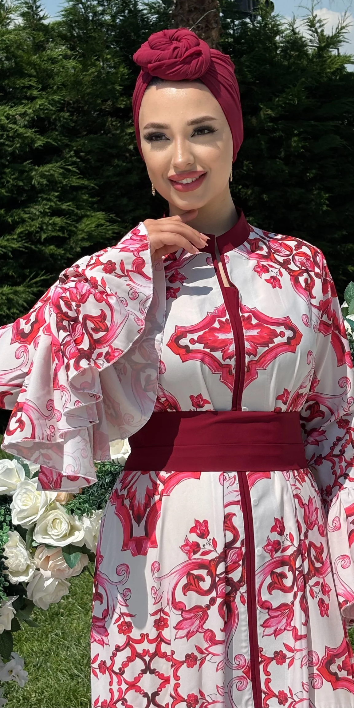 White and burgundy patterned Dubai fabric, airy and elegant design. Belt included.